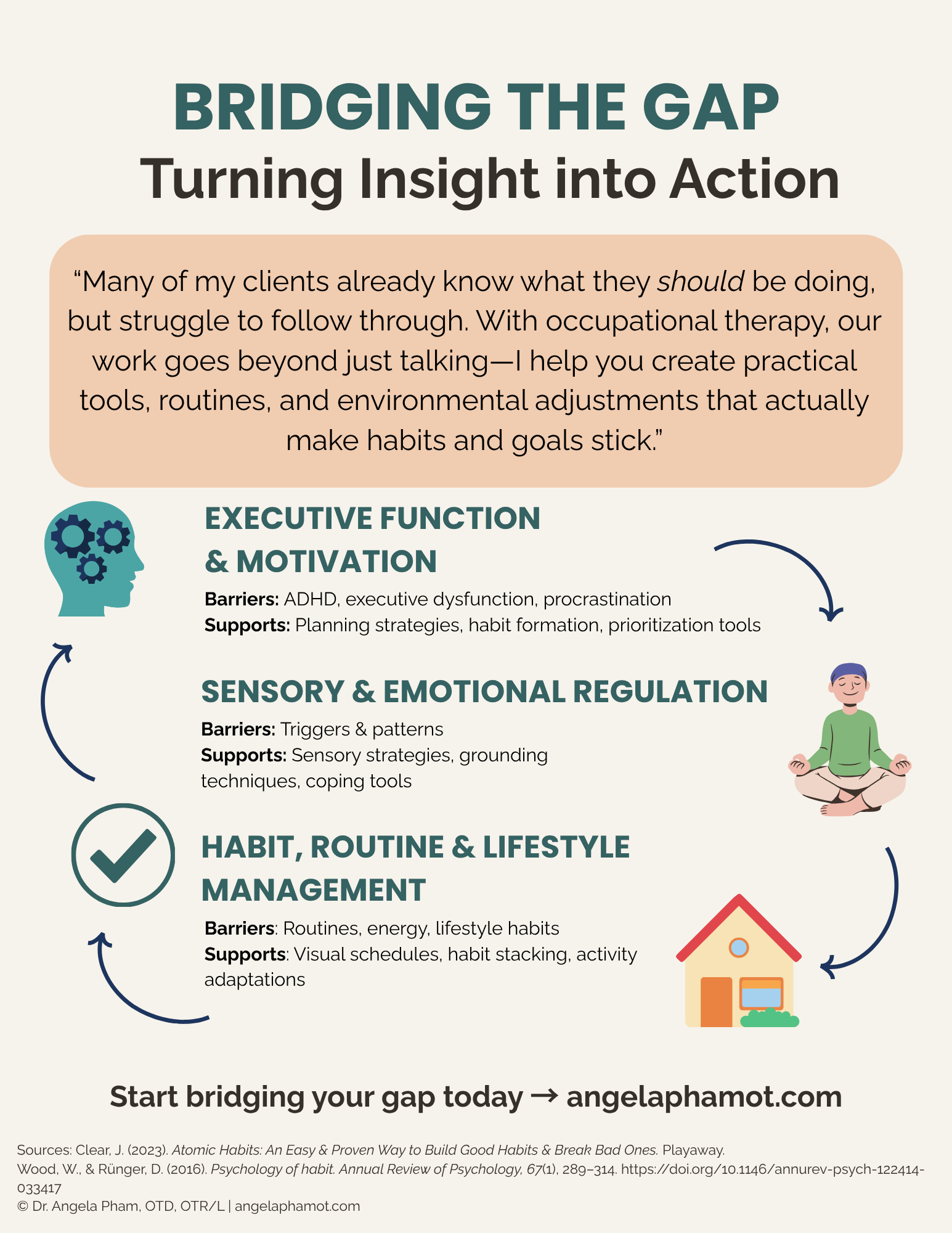 Dr. Angela Pham, Occupational Therapist, is a virtual occupational therapy practice based in California, specializing in helping clients with ADHD, autism, executive function challenges, and lifestyle management. I chose to use my own name for the practice because it feels personal, approachable, and straightforward, reflecting the one-on-one care I provide. Through telehealth, clients typically book 1-on-1 sessions with me, which allows us to tackle real-life challenges: building routines, managing stress, navigating executive functioning, and creating sustainable habits that actually stick.