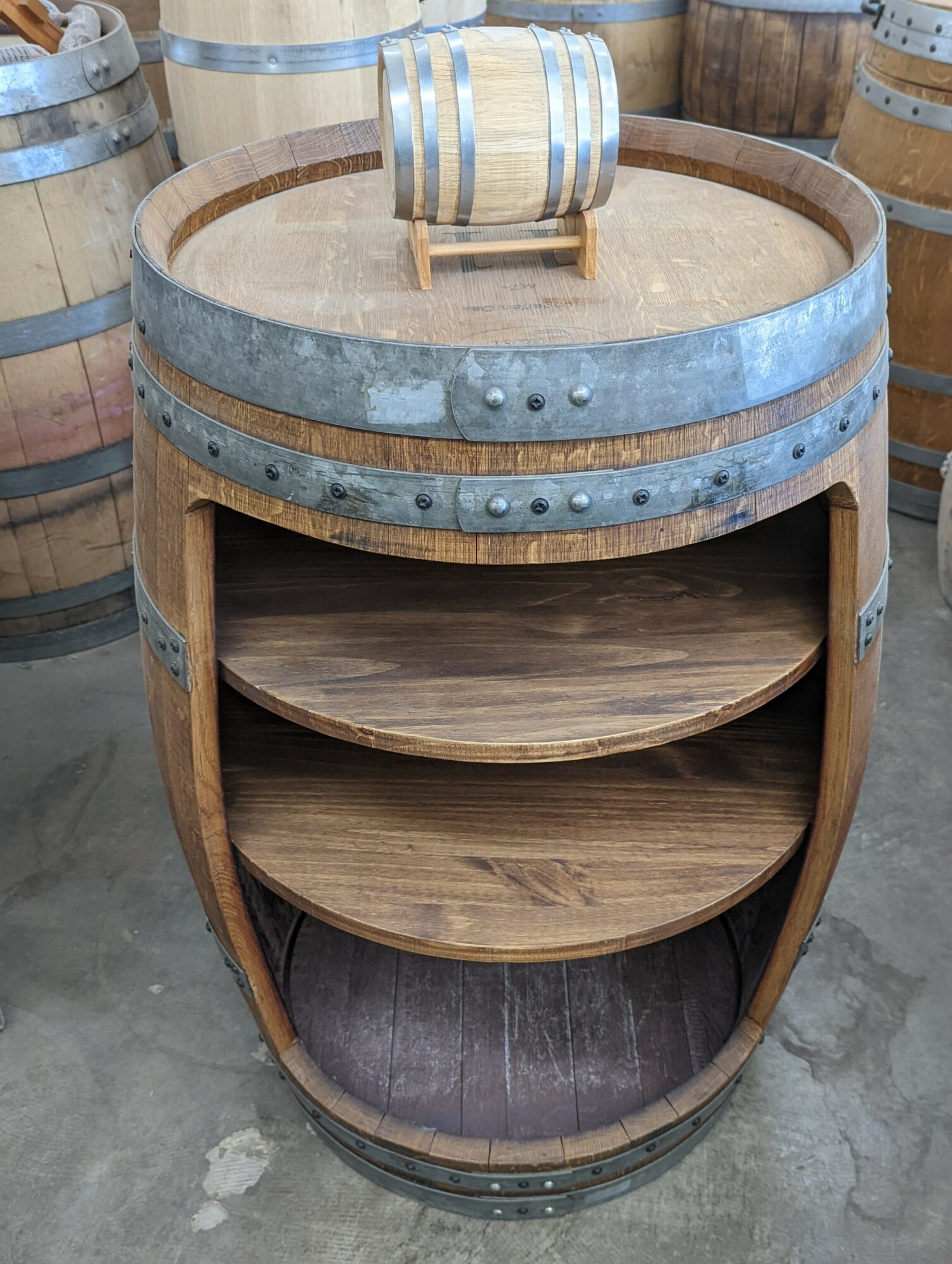 We specialize in listening to our customers’ needs and customizing our products to meet them if possible. This allows us to create unique and personalized products. We will even help our DIY customers create their barrel dreams by explaining and giving out tips to working with barrels. Do we sell a cabinet, yes. Have we made maybe 20 different products out of the same cabinet to meet our customer needs, yes! Have we made products that aren’t even on our website, yes! Our 5-star reviews tell us we’re doing it right: high quality, fine attention to detail, and customer satisfaction. We ship to the lower 48 contiguous states and sometimes we make exceptions to ship elsewhere.