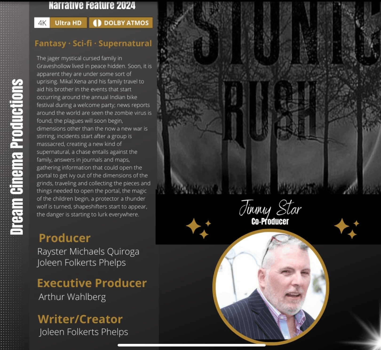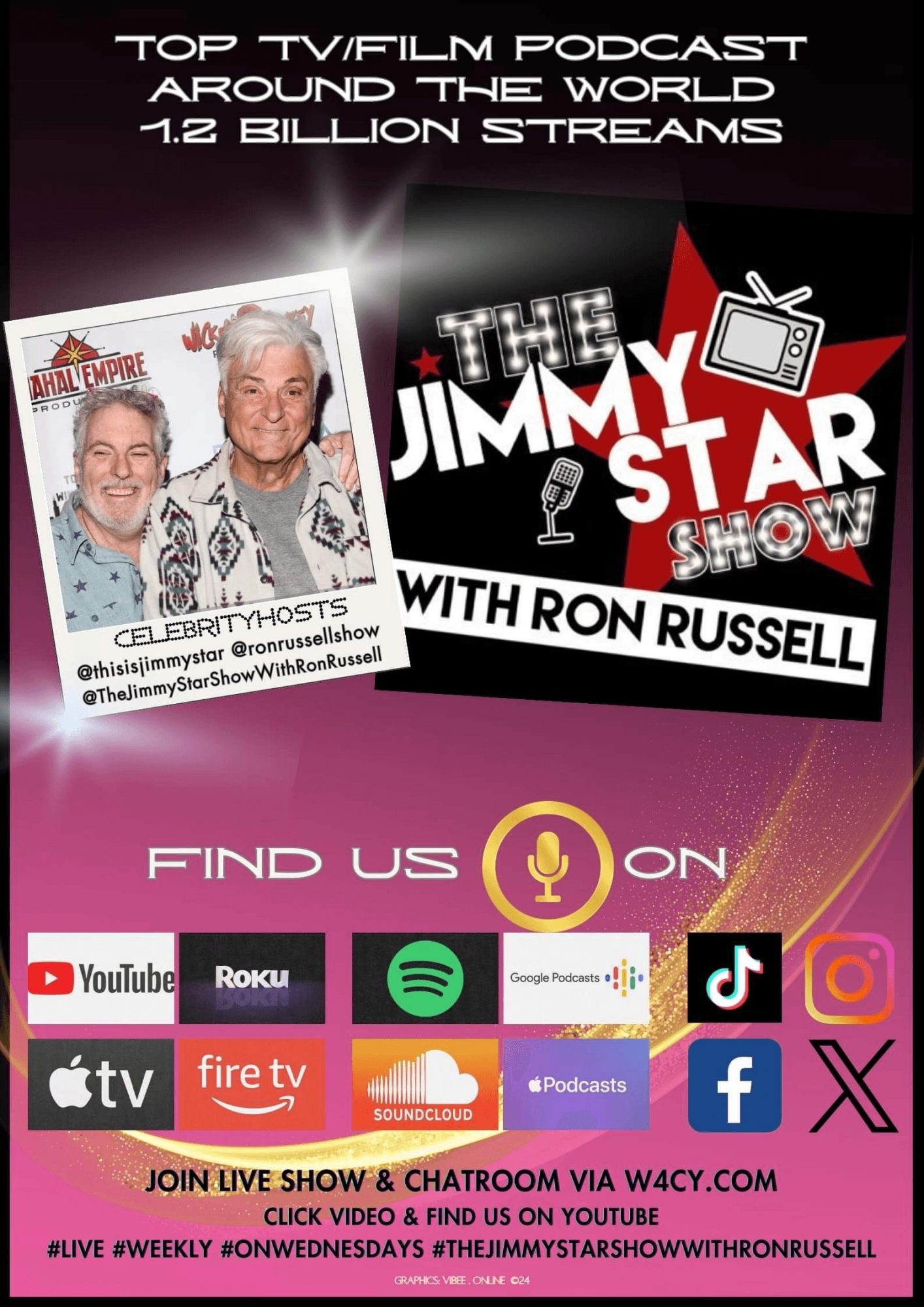 Rounding out the team is award-winning television/radio host Jimmy Star of The Jimmy Star Show with the Ron Russell, the #1 webshow in the world with over 4.5 million weekly listeners/viewers who has worked with John Barrowman, John Schneider, Antonio Sabato Jr, Malcolm McDowell, Morgan Fairchild, Xander Berkeley, Dionne Warwick, Philip Bailey, Jack McGee, John Carroll Lynch, Patrick Warburton, Ross Marquand, Charles Shaughnessy, Christopher McDonald, Devon Sawa, Patrick Fabian, Skeet Ulrich, Stephen Lang, Faison Love, Clifton Collins Jr, Lance Bass, Expose, Sister Sledge, Lita Ford, Melinda Doolittle, Sophie B. Hawkins, Gary Wright, Michael Rooker, Paul Sorvino, Chicago, Earth Wind & Fire, Ethan Suplee, Lainie Kazan, Chad Lindberg, Robert Davi, Taryn Manning and many more including several Emmy nominated Soap Opera celebrities and horror movie icons. (Clive Barker, Michael Damian, Crystal Chappell, Ian Buchanan, Robert Englund, Doug Bradley, Cady McClain, Danielle Harris, Michael Biehn, etc.)