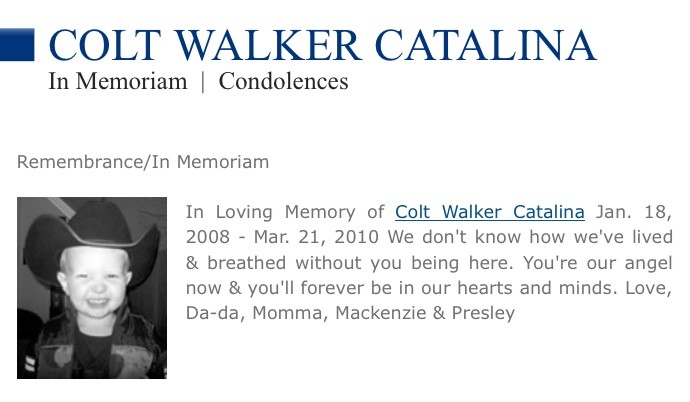 Colt will never be forgotten by those who loved him. Lives have been shattered and hearts left in pieces all because of a preventable tragedy. Not a day goes by we don’t think of him. He is terribly and painfully missed…a pain that does not dull…never goes away. His family and friends love and miss him more than the world can possibly understand. In our hearts, forever our angel, Colt Walker Catalina, January 18, 2008-March 21, 2010.