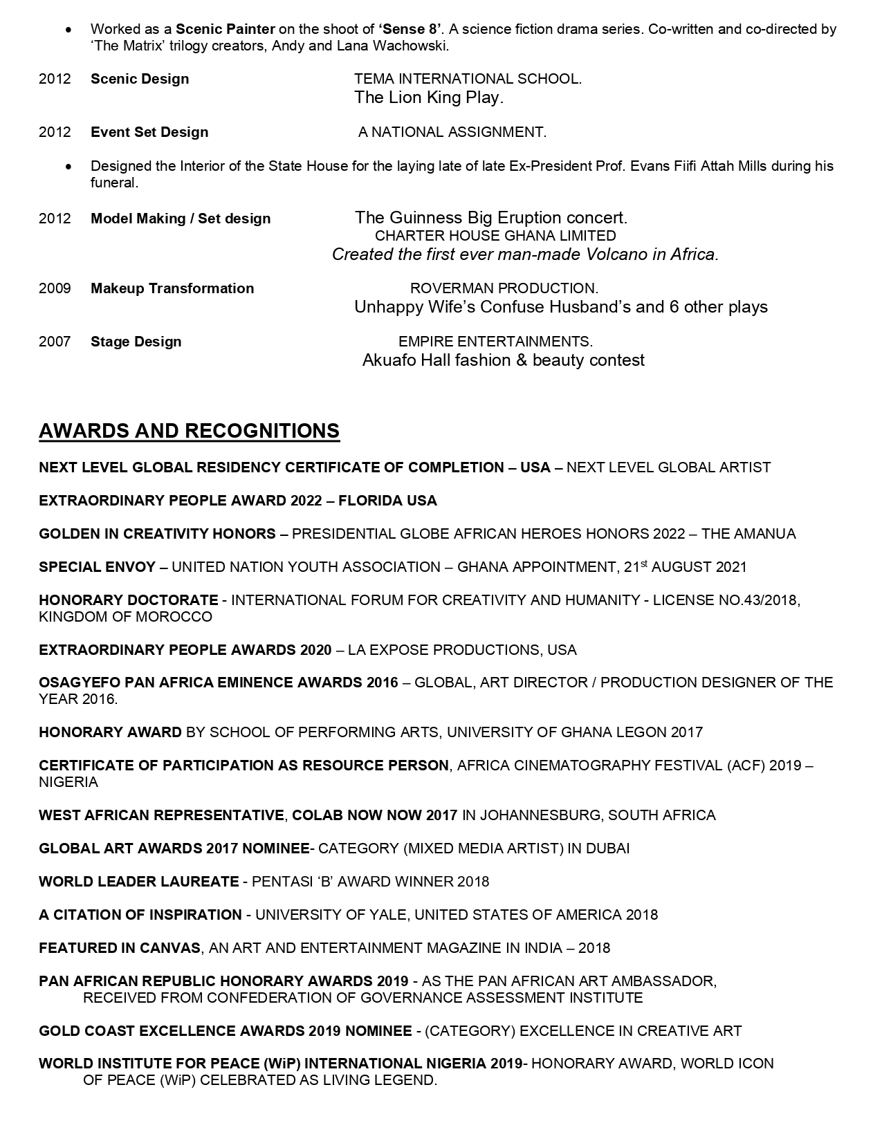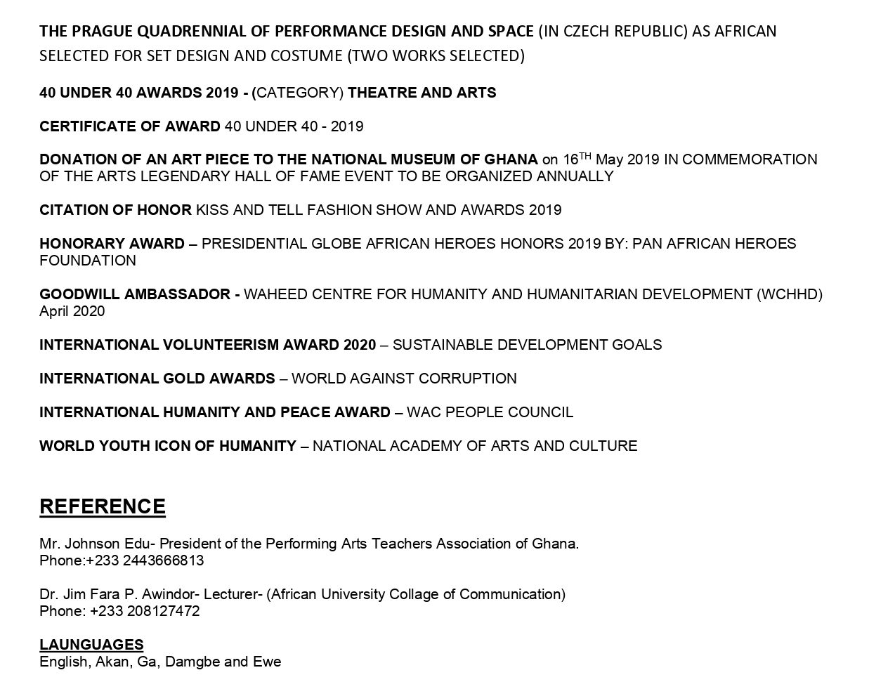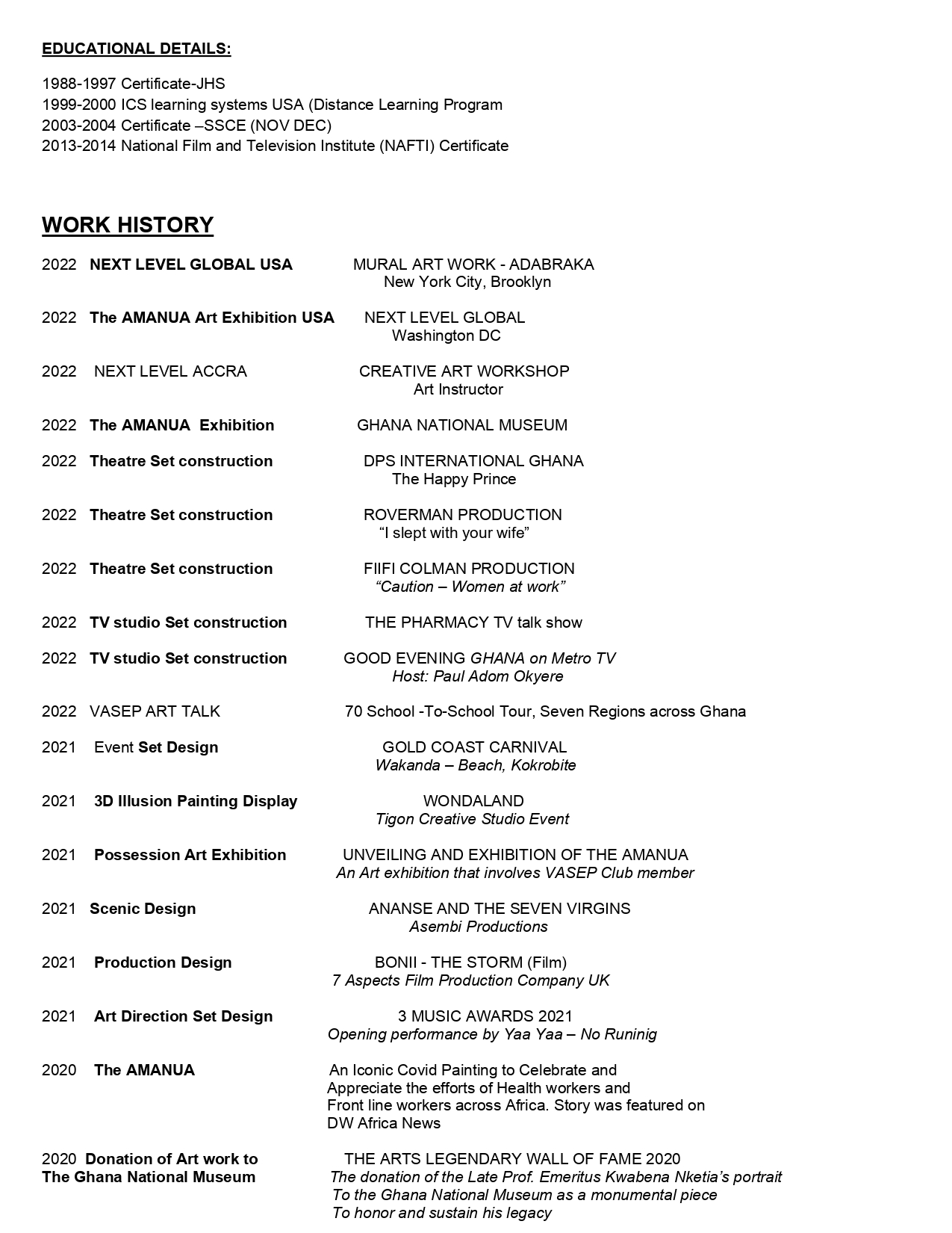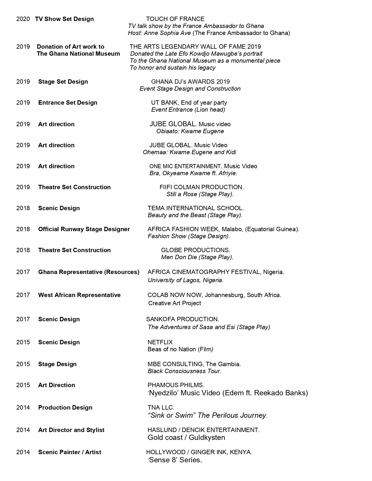 I will give thanks to my Uncle Dr. Johnson Edu the former technical director; National theater of Ghana for taking his time to groom me and all the Art Masters that helped shape my career. My capabilities to draw, paint and visualize got me to study Art Direction and Production design in a film school at the (National Film and Television Institute) UniMAC which I graduated with a diploma certificate in 2014.
