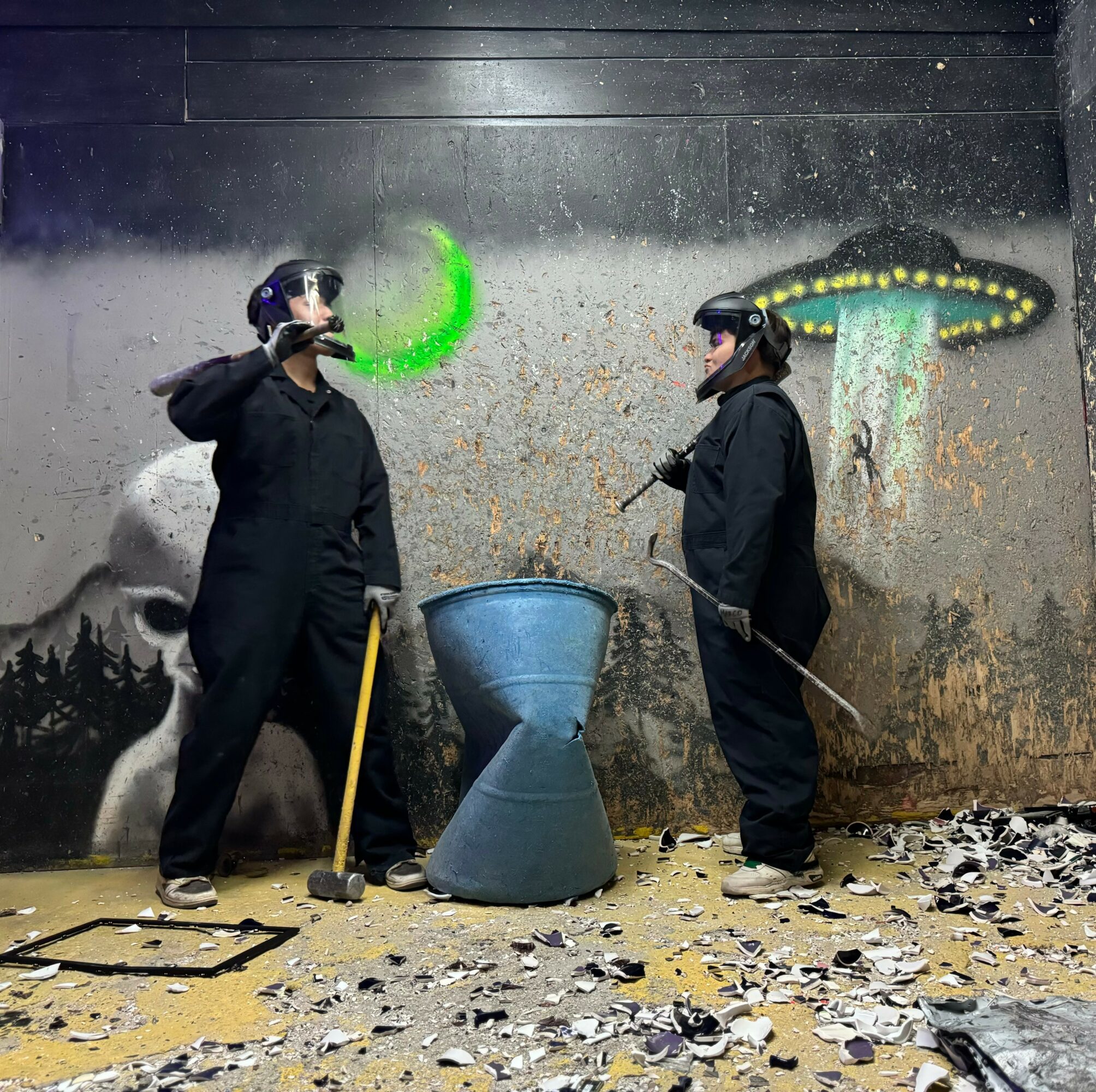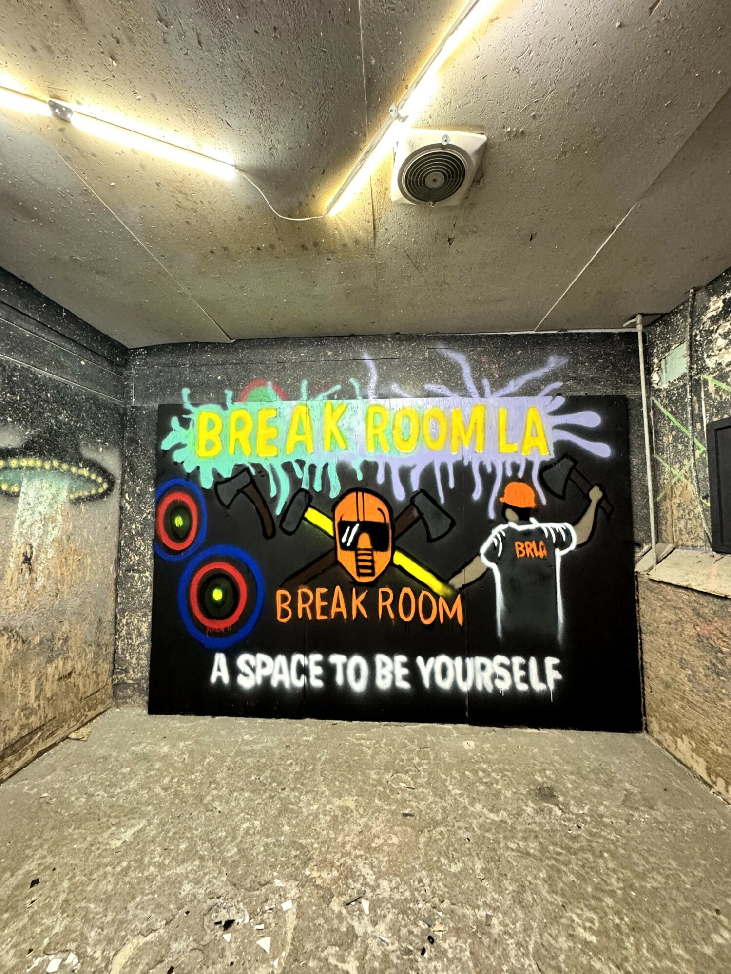 At Break Room LA, we specialize in creating unforgettable experiences where people can trade stress for satisfaction, one glorious swing at a time. Whether you’re aiming for a bullseye at axe throwing, unleashing your energy in our rage room, or turning your paint skills into modern art, we make it socially acceptable (and ridiculously fun) to break things!