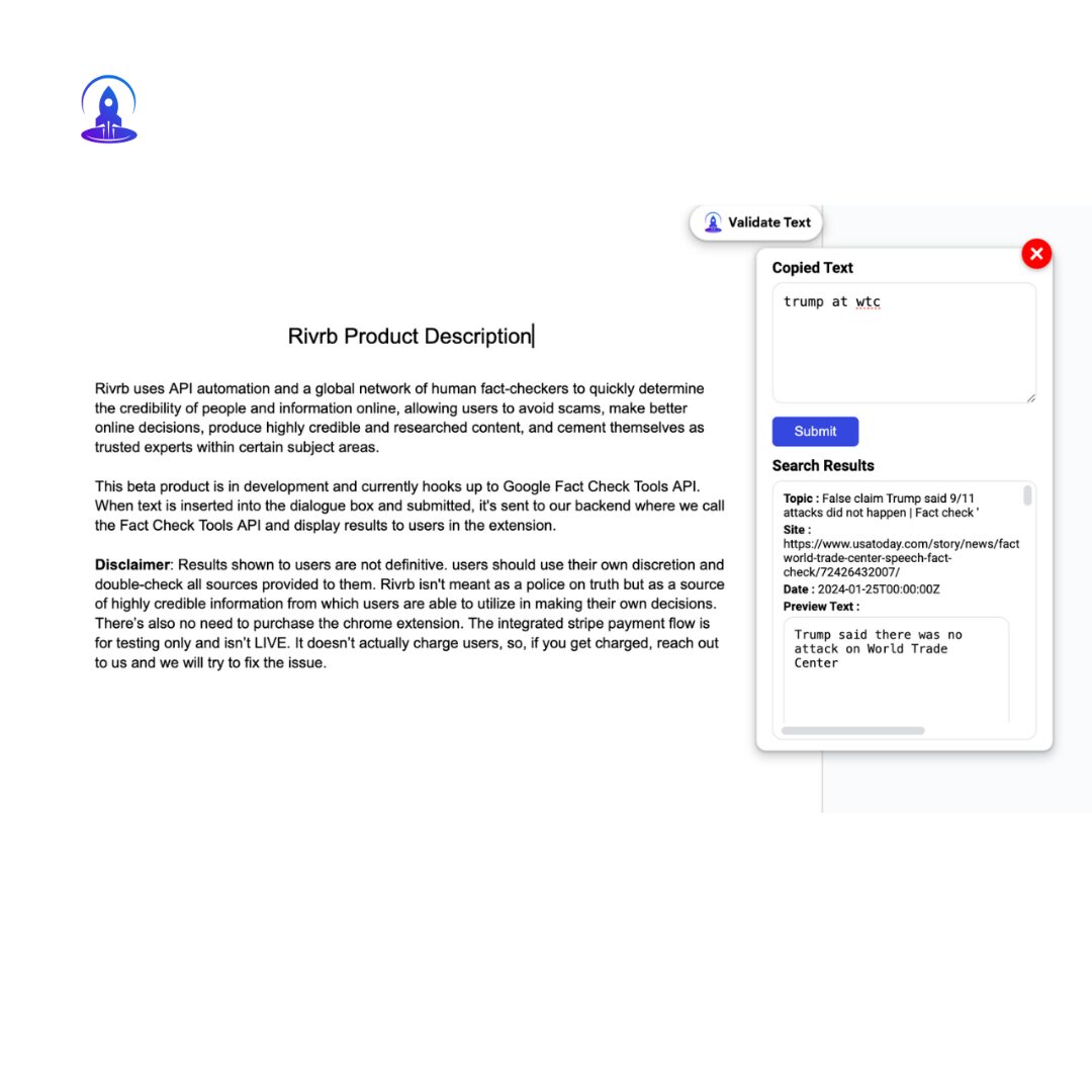 Rivrb is different from other products on the market because it’s a unique combination that protects the integrity of information people consume both on the general internet as well as on social media. This allows individuals to truly feel secure when consuming content no matter where they find themselves. The use-cases for Rivrb are endless: YouTubers can use it to fact-check their uploads before posting and provide their viewers with a fully researched transcript, buyers are able to get automated reports on sellers from different platforms so they can make informed decisions, students can use it to speed up their research workflows, etc.