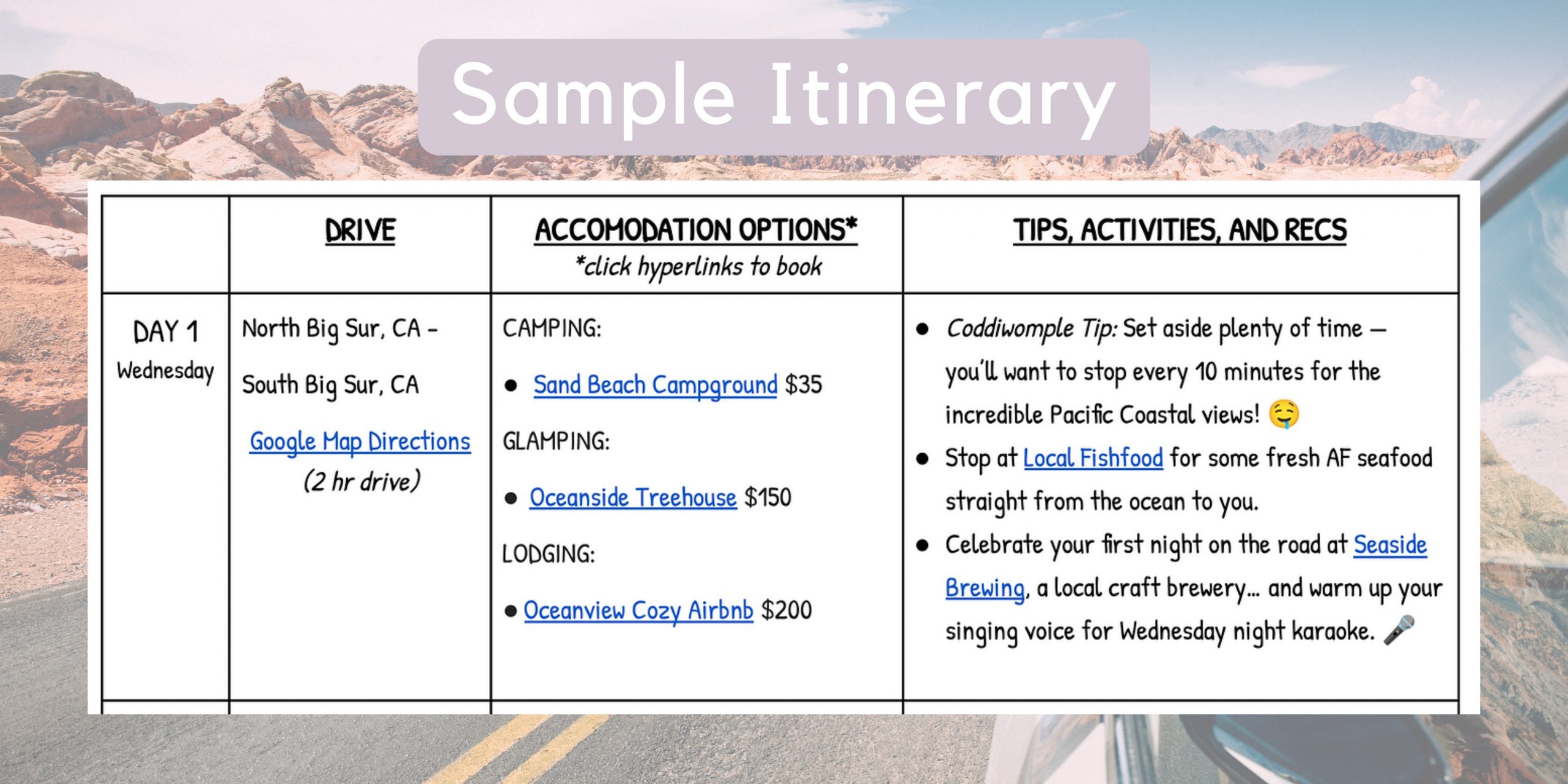 Coddiwomple Trips started with my old 2009 Toyota Corolla, a $25 tent off Craigslist, and three weeks on the open roads of America. All sounds great, right? Until I realized I had all these National Parks and US cities on my route and… 0 campground reservations. So I pulled over at a local brewery with my laptop, researching every single campground on my route including adorable yurts, private treehouses, spiritual hot springs, charming bed and breakfasts — flash forward six hours later: I had created the most epic road trip EVER with an adorable and safe place to set up camp every single night. Even better than the rush I got from that planning (yes, I’m a Virgo moon lol), was the incredible experience that I had over those three weeks through South Dakota, Yellowstone, Montana, all the way through Oregon to the Redwoods of California. After seeing me absolutely crush the scheduling, my partner was like “uh… you should do this for a living.” And so Coddiwomple Trips was born. I created my LLC, went on several more road trips for research, and started gaining clients that wanted to do what I was doing but didn’t know how!