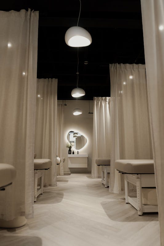 Redefining the traditional spa experience, FACE FOUNDRIÉ features an open concept design that feels expansive yet intimate, with draped curtains offering privacy without confinement of small treatment rooms.