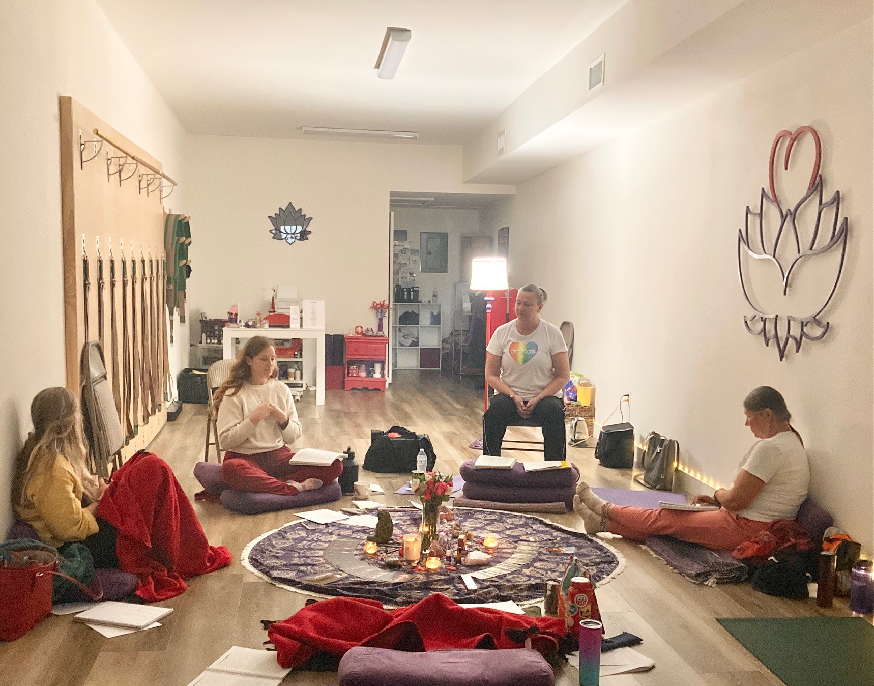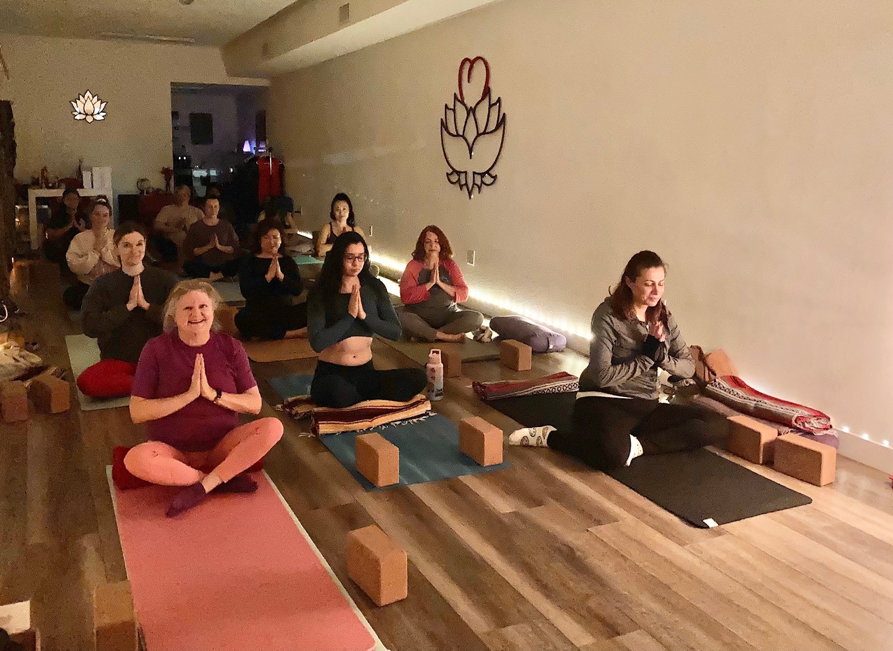 As far as the class categories, we do share basic, hatha, gentle vinyasa, vinyasa, vinyasa + weights, yin, yin + sound healing, restorative, restorative + Reiki, Nidra + mantra, candlelight, sunrise, and yoga wall classes. Beyond our class schedule, we have regular workshop offerings of Reiki + Sound Healing, Breathwork, Cacao, Music & Mantra, Meditation, and Acro workshops. We also hold workshop series connecting trauma + yoga and the chakras – subtle energy system.