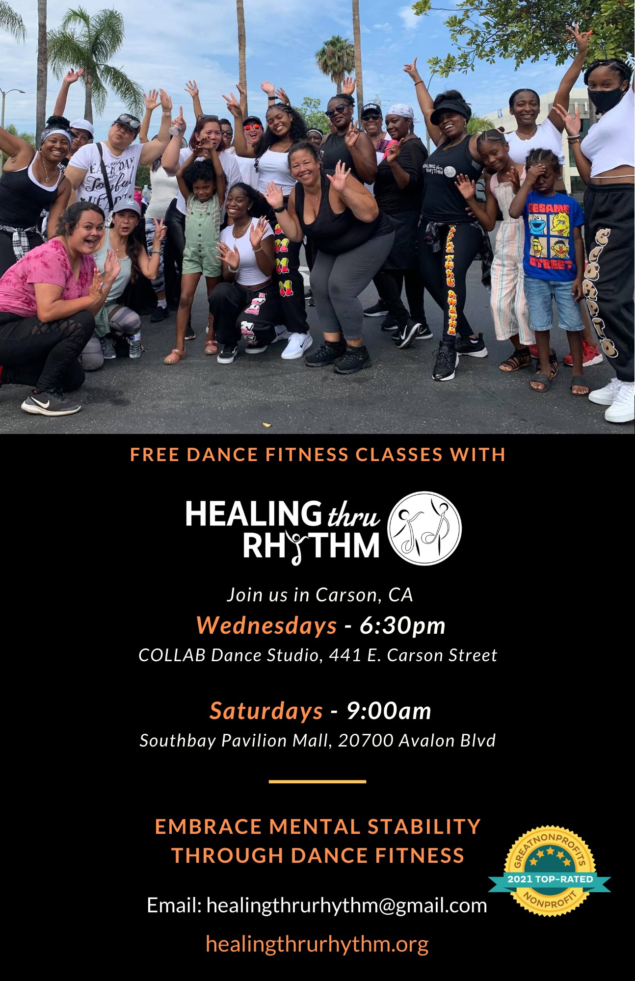 We are proud to offer our classes free to the community or anyone who would like to join us twice a week in the Carson, Ca area. Every Wednesday, 6:30 pm at COLLAB Dance Studio and Saturdays, 9:00 am at the Southbay Pavilion Mall outdoor parking lot.