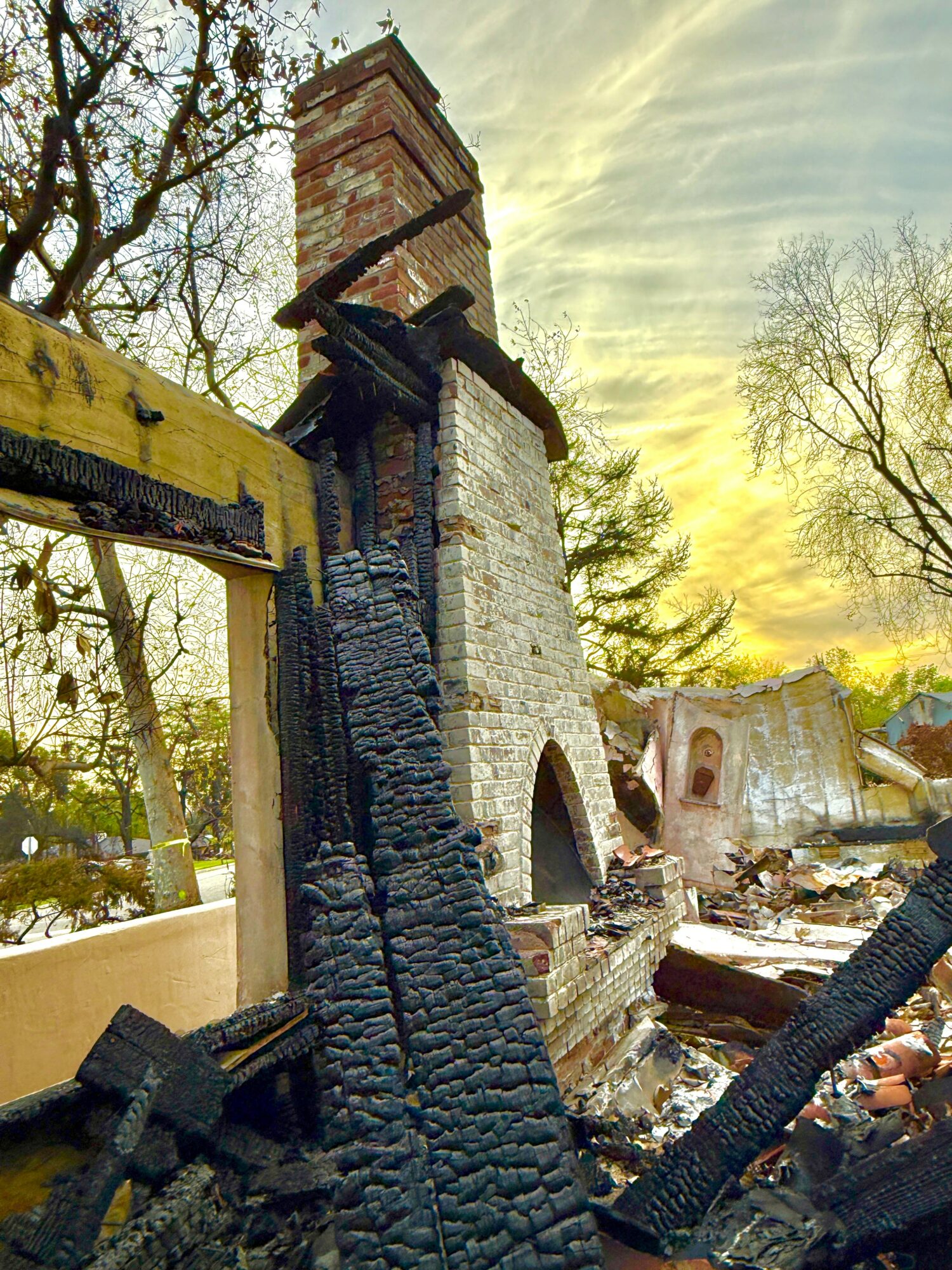 I finally created what I call my Eaton Fire Chimney Project with a particular focus on the chimneys – how they were so resilient, still standing when most everything else was burned to the ground. They were like tombstones, marking their territory – but also so symbolic of so much more – of the lives that had been lived, the milestones experienced in each house, time with friends and family in front of the fire – times that were important – history that mattered and I wanted to highlight that somehow, to help to memorialize what had been there – knowing that much if not all that remained would eventually be wiped away – so that it would never completely die, never be forgotten.