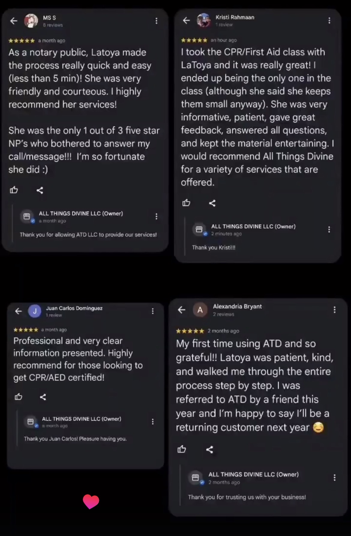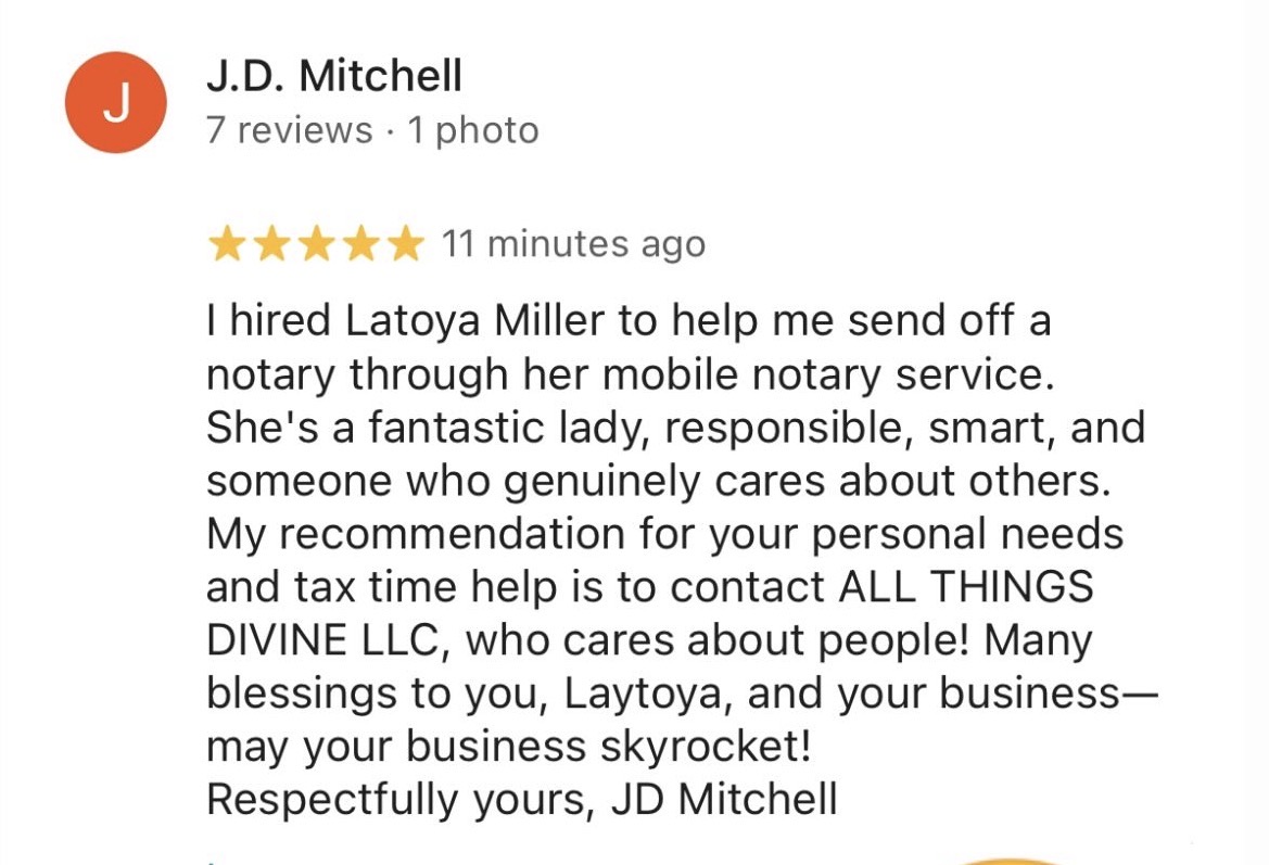 My name is Latoya Miller, owner of All Things Divine, LLC. I started my company under the name Divine touch tax services in 2011. Main focus was tax preparation. I have now expanded into Notary public, loan signing, small business bookkeeping, business formation, business advisory, web design and management, and I offer CPR certified courses through the Red Cross. What makes me stand out from different businesses is my client relationship. When it comes to my services that I offer, I explain to my clients the benefits of the services, the pros and the cons so that they may weigh their options. It’s very important to me to make sure that my clients understand the services they are getting. In tax preparation I explained to my clients line from line, what credits and deductions they qualify for and how to prepare for a better tax year. My prices are affordable and focus on low income families.
