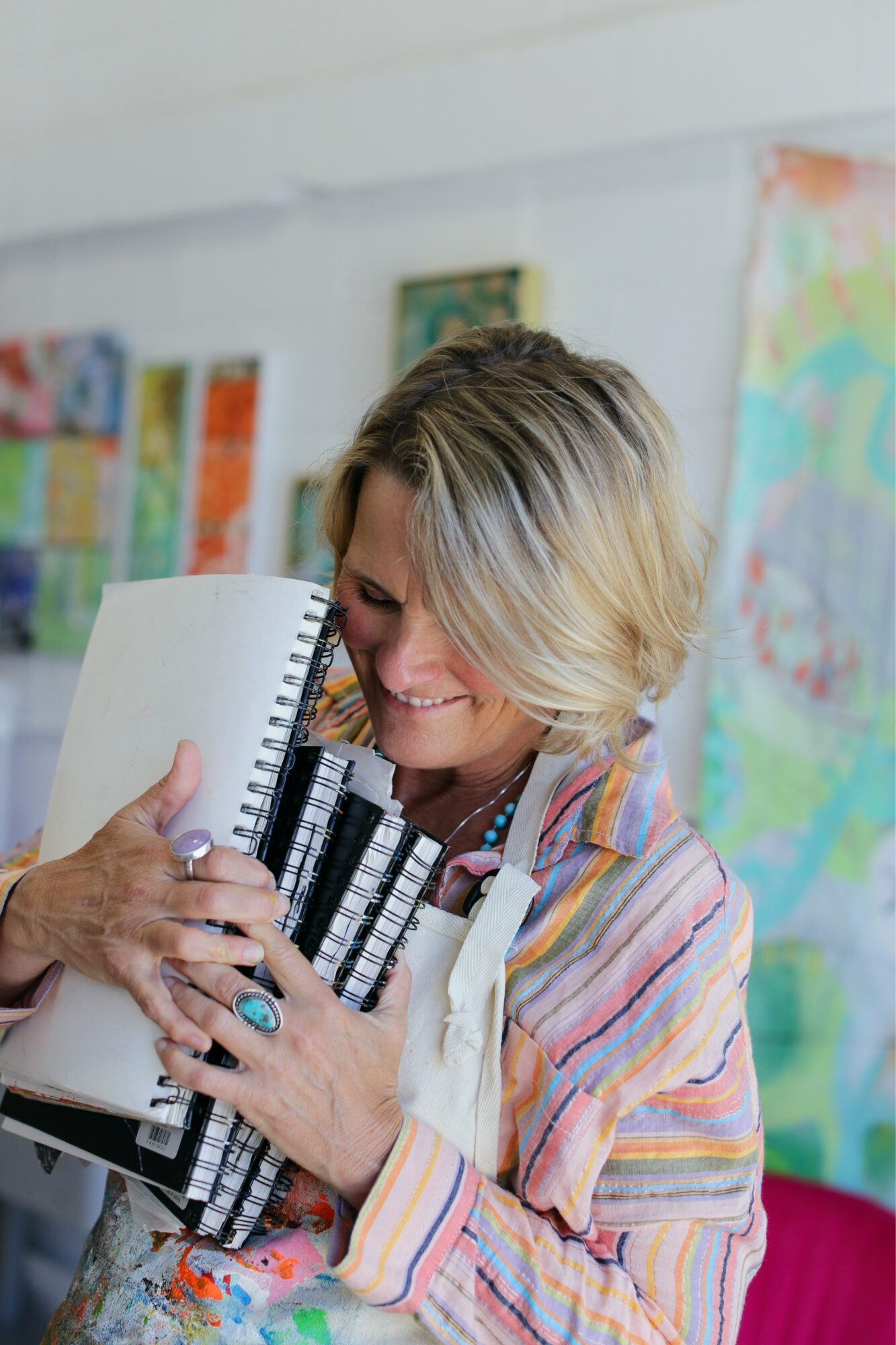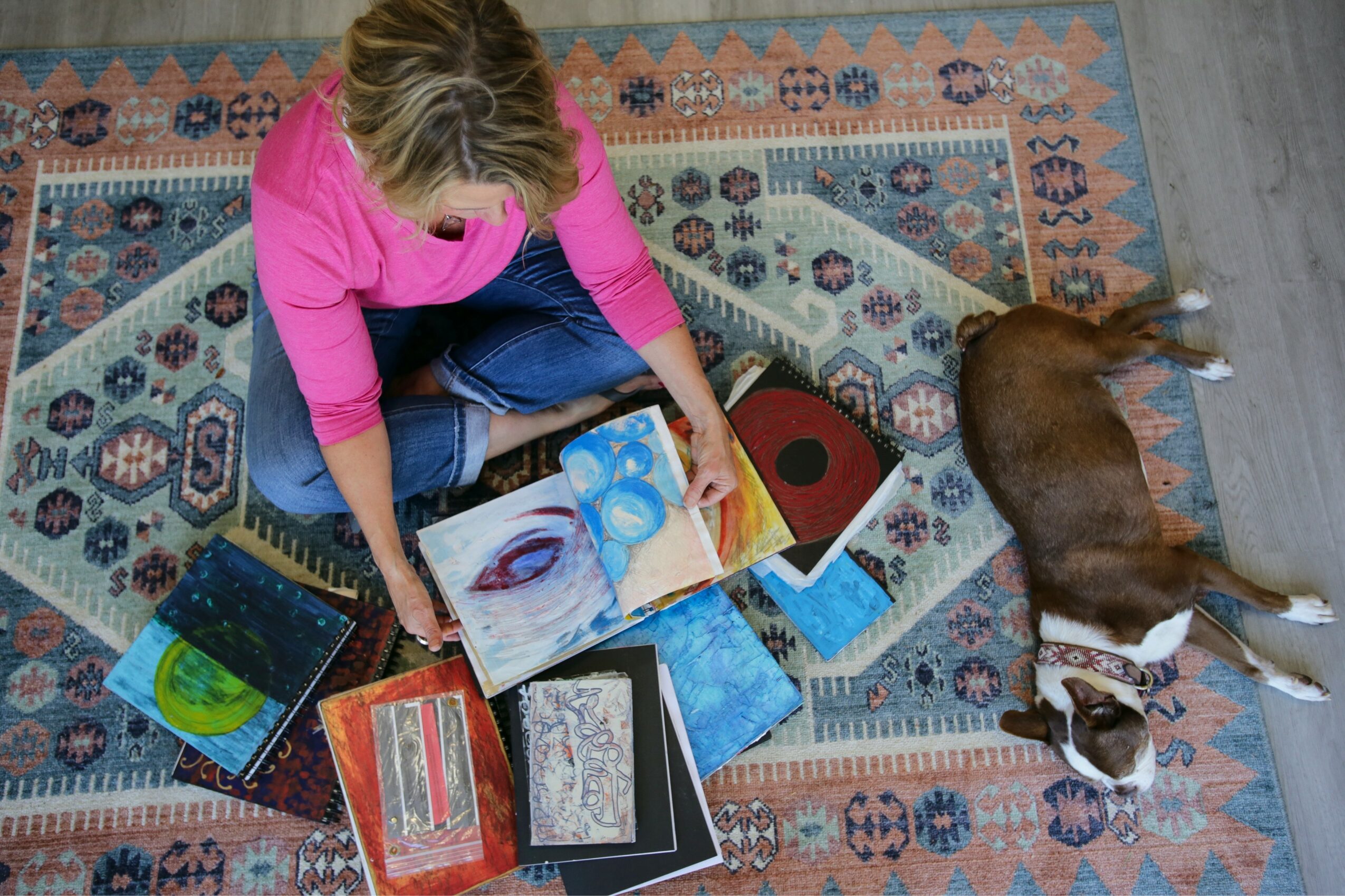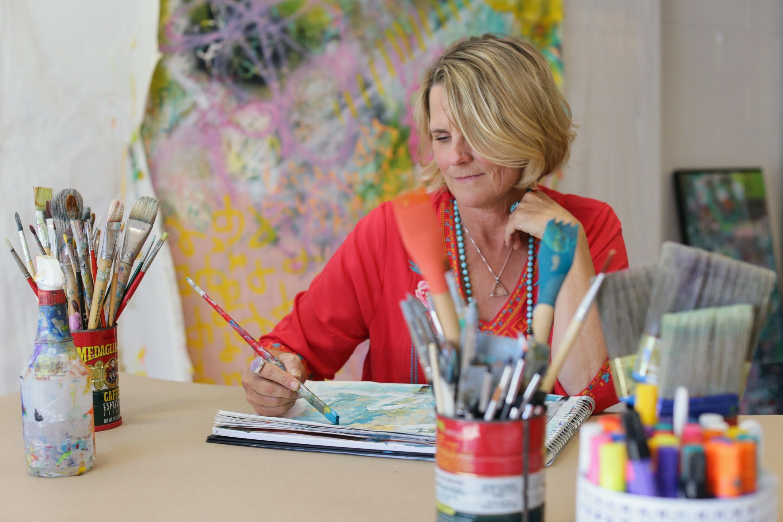 I get up early and keep my mornings intentionally slow and spacious. I start with coffee, mellow music, and some writing that allows me to express everything that’s inside me and clear out the cobwebs. Then I move into my home studio for my morning devotional art practice. I usually spend anywhere from 30 to 60 minutes there. It’s less about making a finished product and more about moving energy and allowing whatever needs to be expressed to come out. That process grounds me and sets the tone for how I move through the rest of the day.
