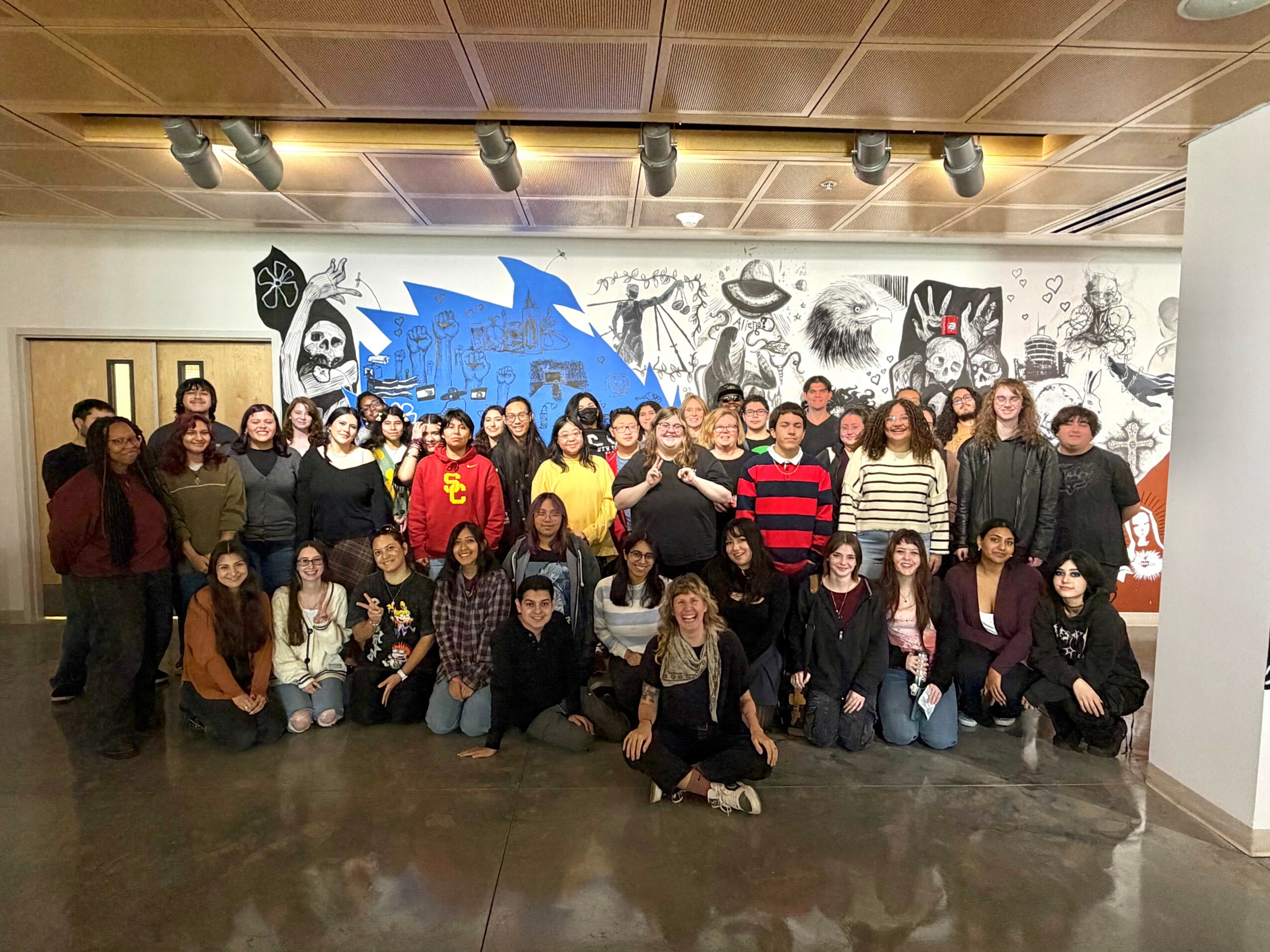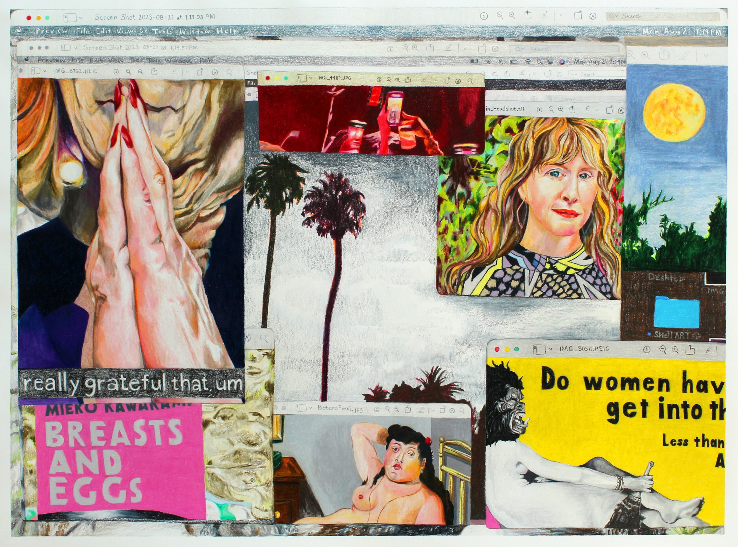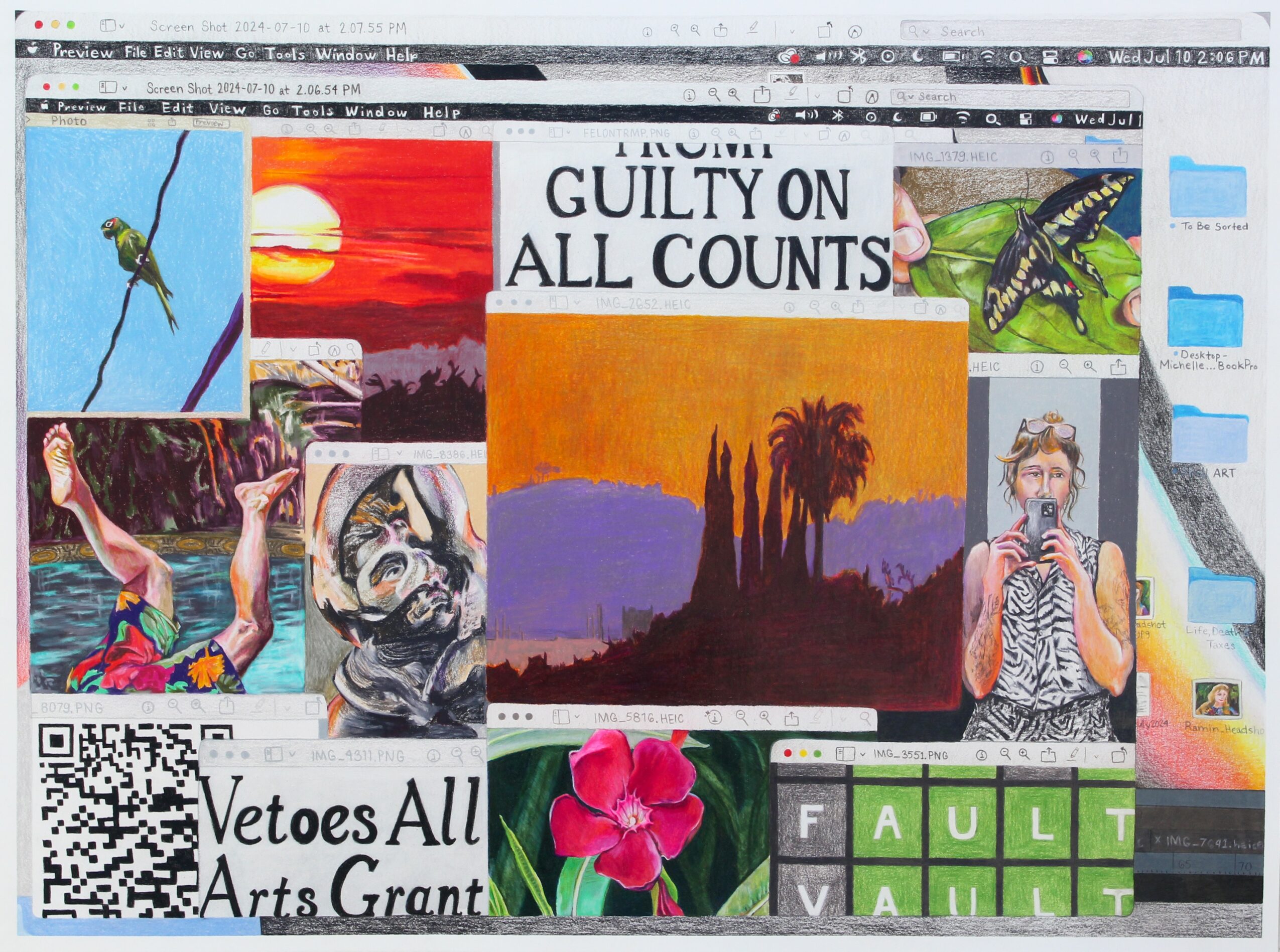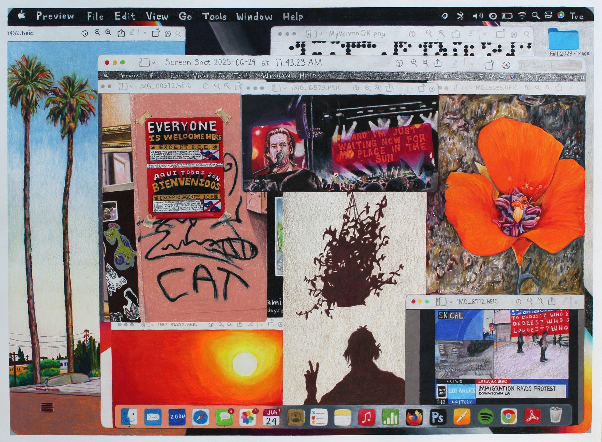 This is such a tricky yet important question – especially in the age of social media and AI. I definitely present a positivity to the world as much as possible – in my classroom, on social media, in groups of friends, etc. It’s a true version of myself, but it’s not the whole story. I think I intentionally present the positives to manifest more positivity, in hopes that it might spread. Who doesn’t need more positivity in their lives? As someone who struggles with depression and anxiety though, I definitely go up and down, often daily or even hourly. Only very close people in my life see that part of me. I’m also an empath, and so I take in and process and feel what others around me are feeling, and it can often be overwhelming. It’s not necessarily societally acceptable to talk about that overwhelm or frustration or deep sadness, so we learn to mask. I talk a lot about masking in my artwork, and I talk to my students about this concept all the time. The only person who really knows who we are is ourselves. The versions that we present publicly are often true, but they are just one side of many – as we are all multi-faceted, dimensional, and complex beings. Social media and now AI really disrupt this idea of what is “real” – I wish there were a way for all of us to still stay connected while also leaving social media, en masse.