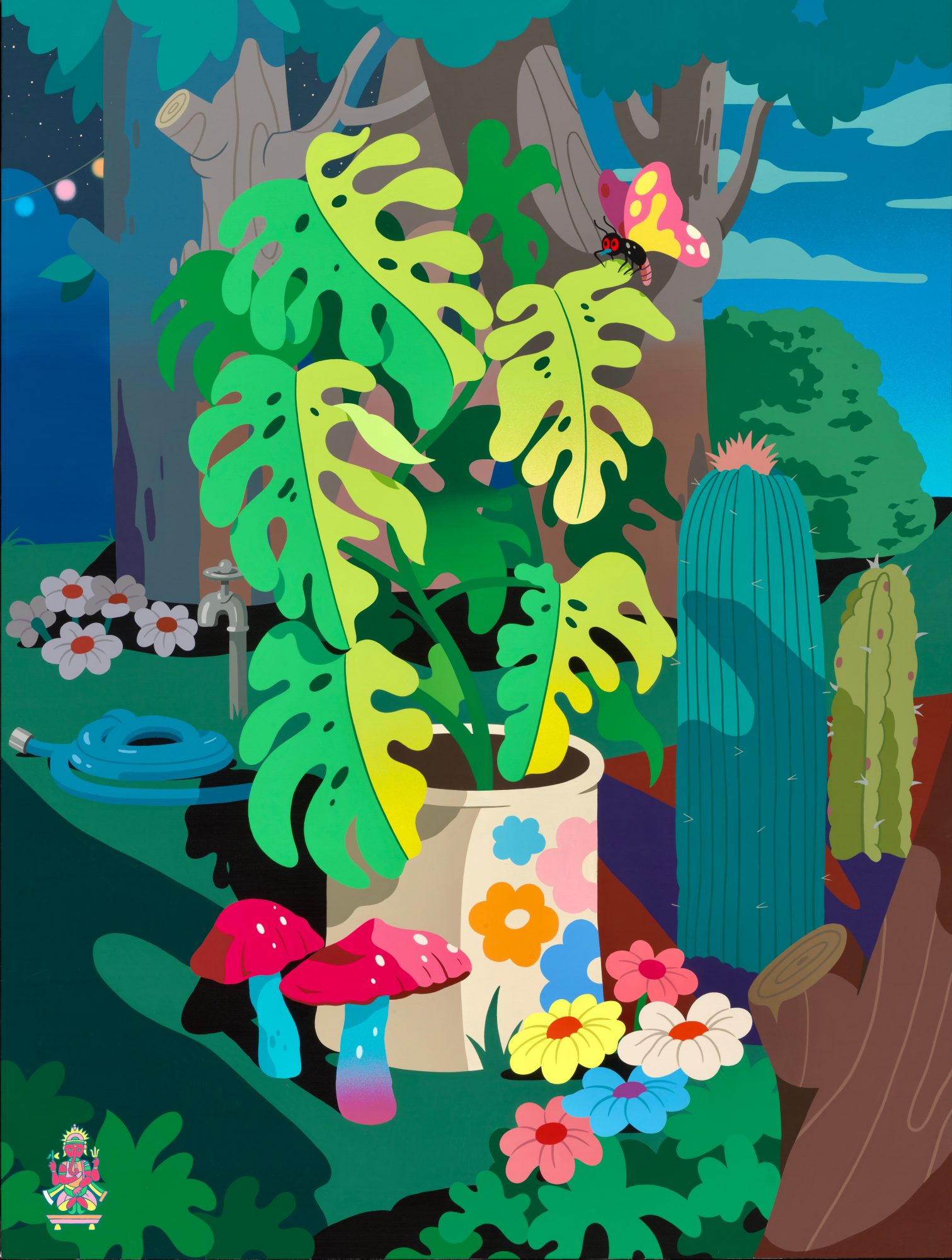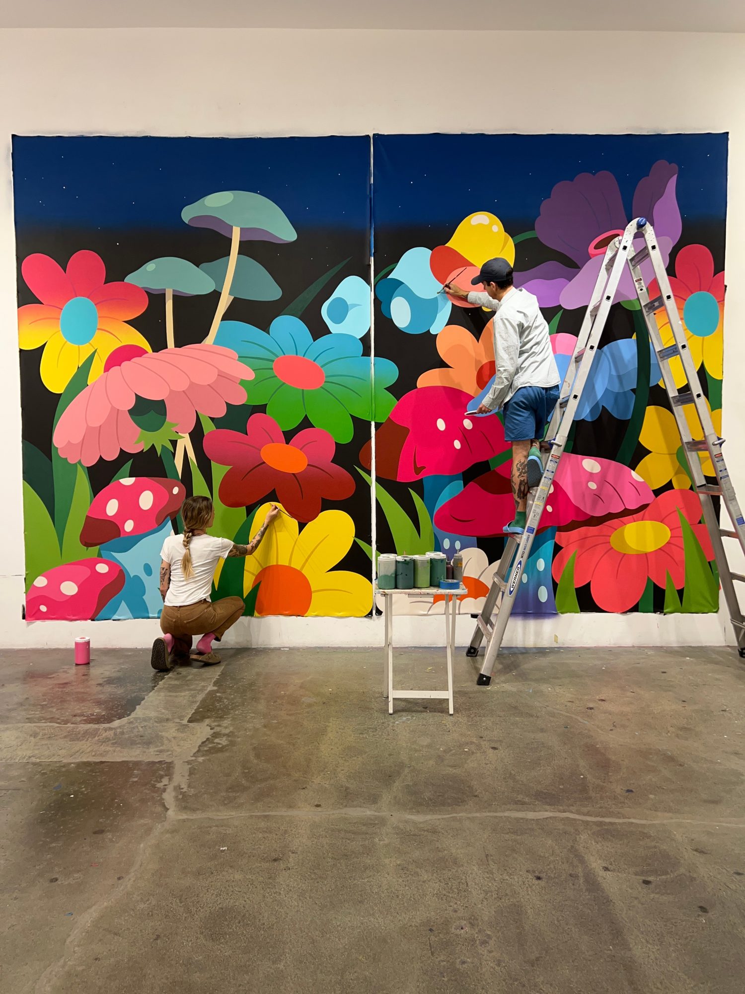We are a married couple that collaborate as visual artists. We are most known for our paintings, which are very bold and bright in color. Our use of color is something that is a strong point in our work for sure. As well as paintings we also work in other mediums like ceramics. We also love to collaborate with brands and certain commercial projects. Designing for different mediums and outputs is a lot of fun and a great way to bring ideas to life that maybe wouldn’t have a home in the universe of our fine art paintings!