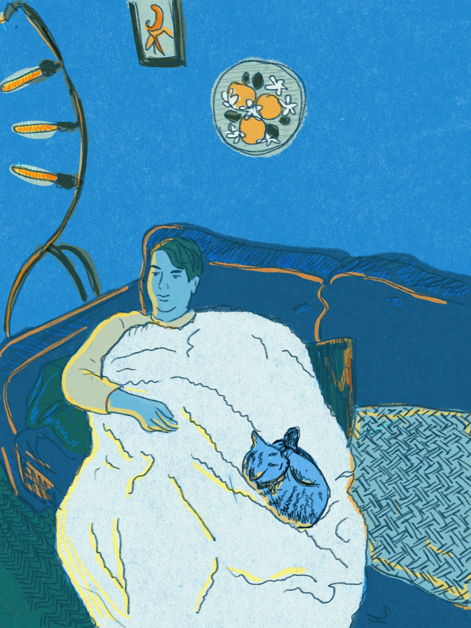 My work exists as an illustration, writing, painting, and drawing, approaching each piece observationally-personally-emotionally. I explore memories, human connection, and the natural world through a reflective, colorful, and compassionate lens. I’m often seeking softness and comfort in my work, and I gravitate toward vibrant, complementary color palettes. I feel like in my writing and drawings there’s a contemplative voice that has connected with people. I’m most proud of my book “Feeding the Line” that I self-published in 2021 that weaves together artwork, writing, and design. In it, essays about colors, mental health, family, and other observations are paired with drawings conceived in the course of over a year. I was moved by the connections and conversations I had with others who could relate to my work.