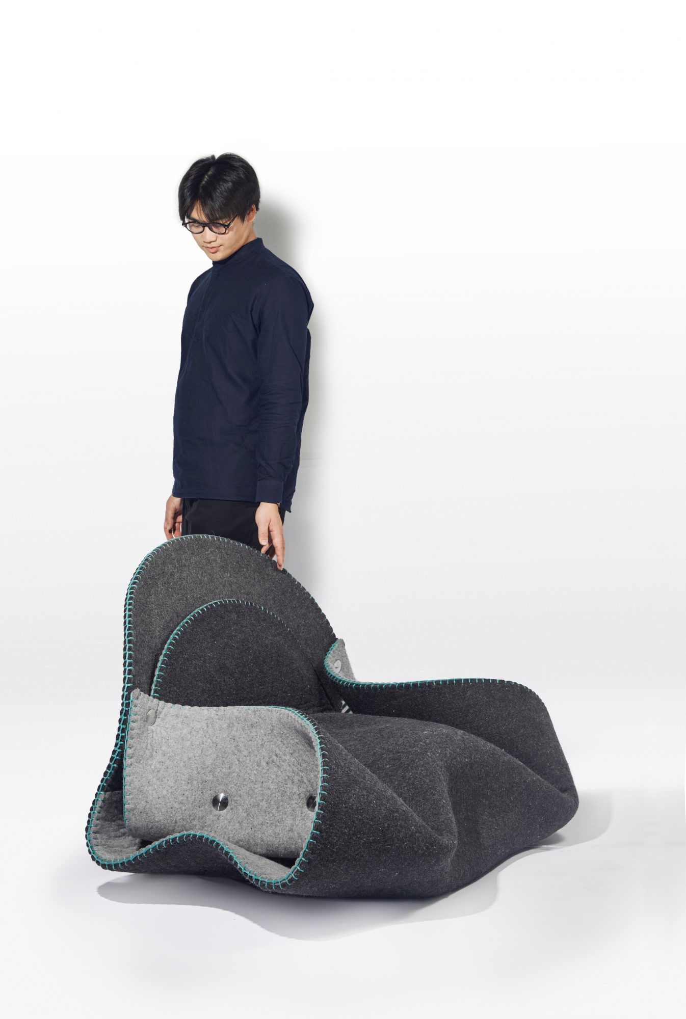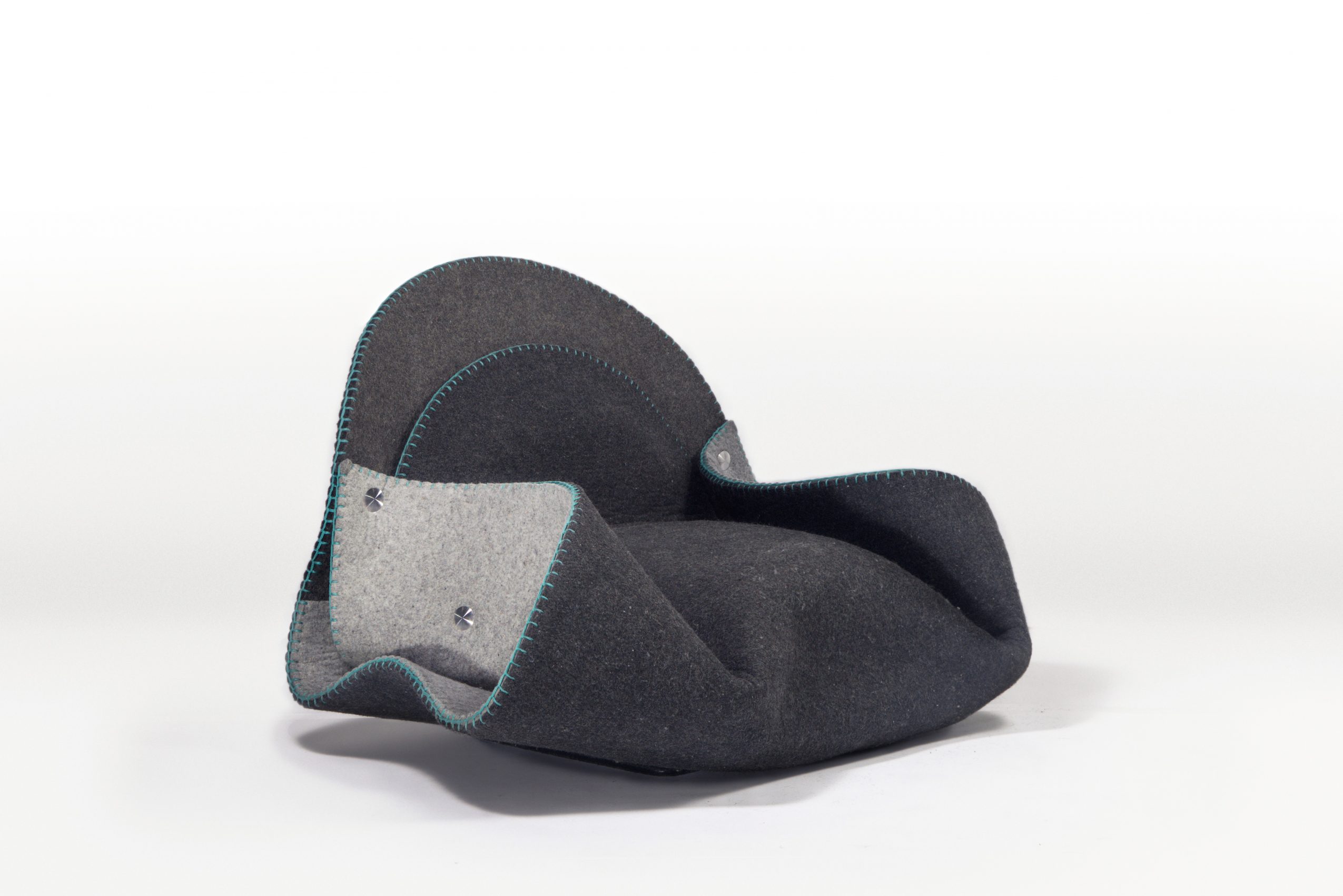 People enjoy reuniting with family and making dumplings to celebrate the Chinese New Year. Folding, pinching, and sculpting together create a lively atmosphere. The Fortune Fold is a chair derived from the folding process of making dumplings; it was an innovative moment in my childhood. The form is folded and sculpted with a piece of industrial felt, which wraps up the upholstery. The shape is fastened by six-round components to discuss the possibility of the structure and innovate the furniture-making process.