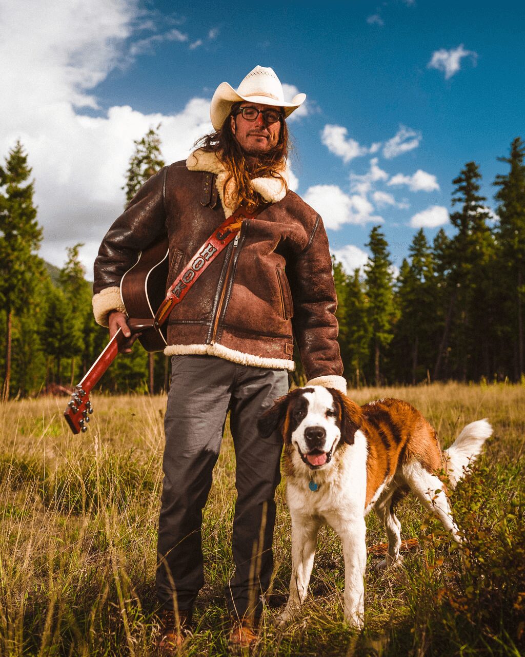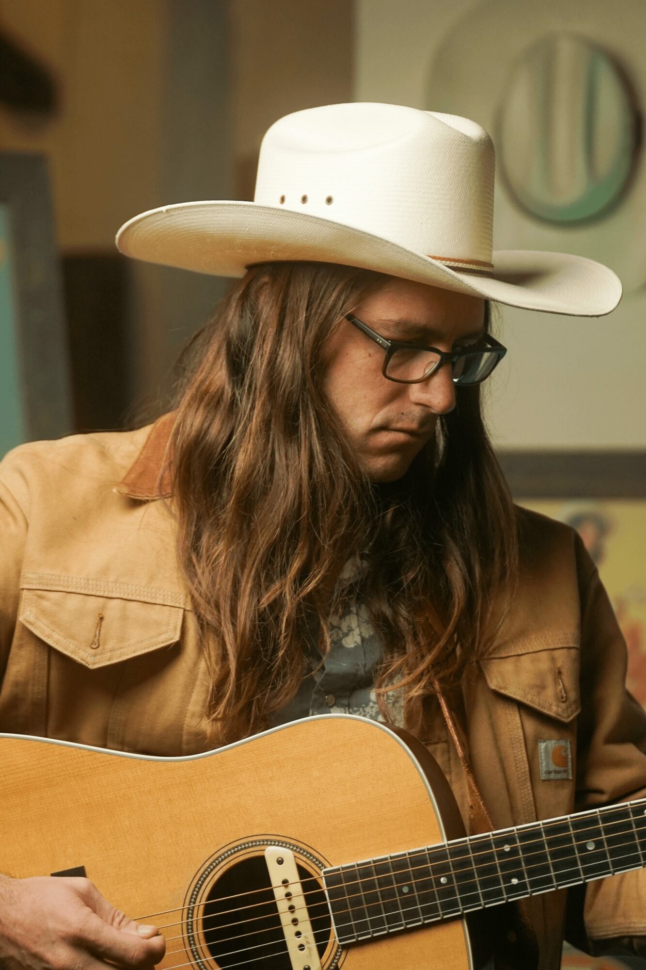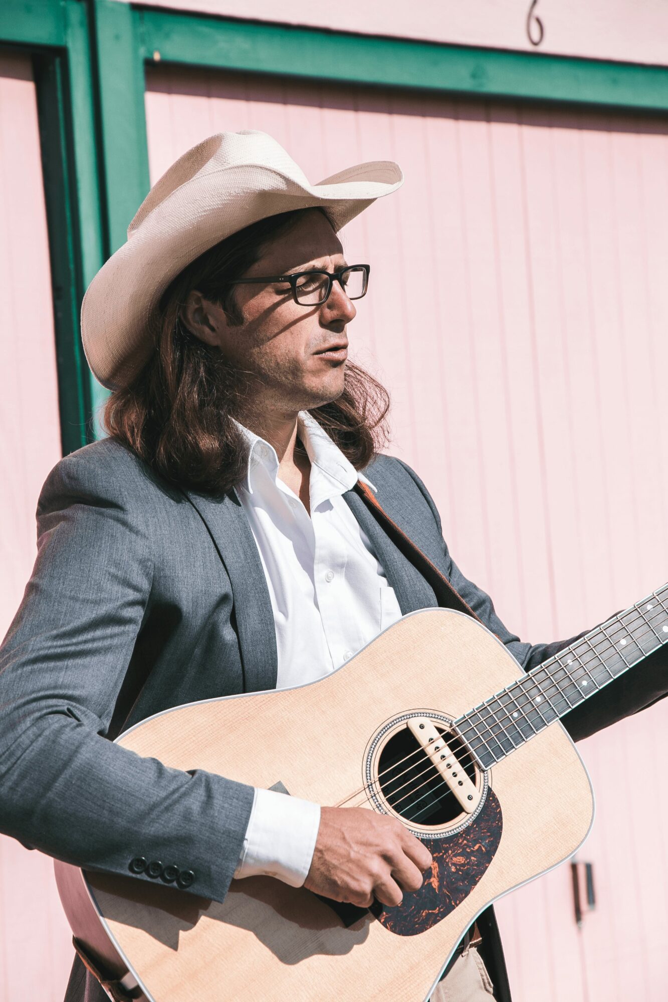 Shot of brown jacket looking down with guitar: Justin Daniels