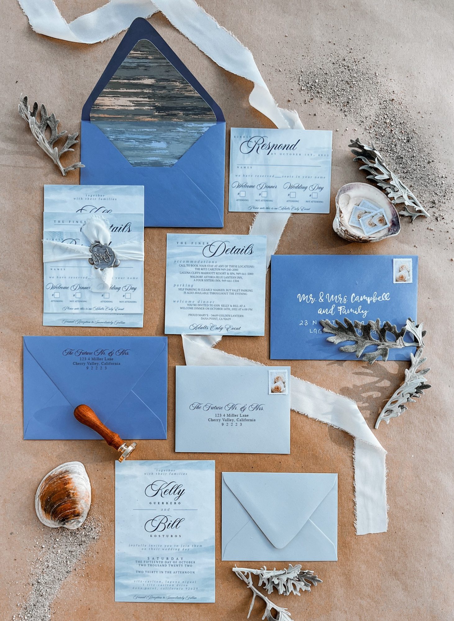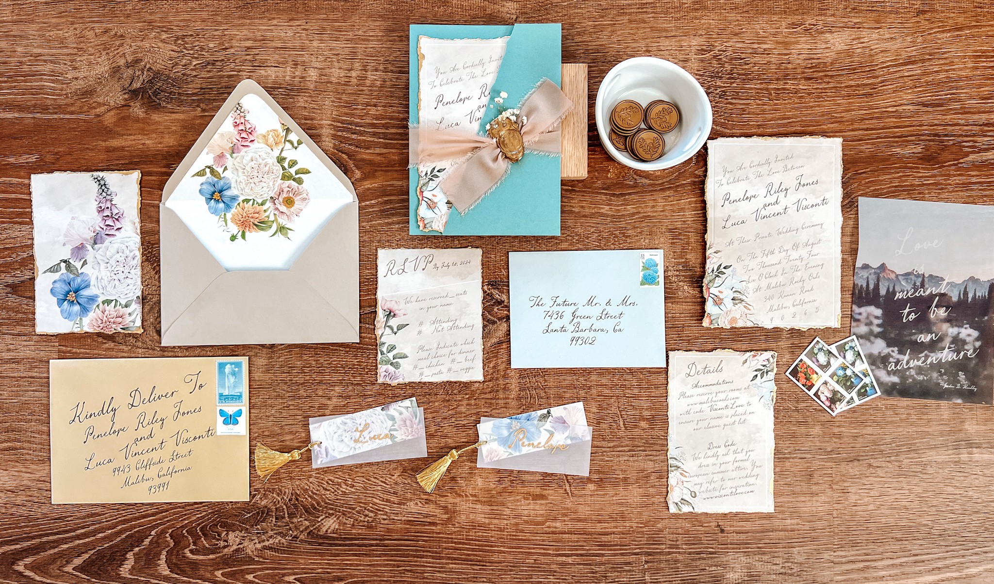For instance, I recently had a couple describe their desired invitations as “storytelling, rugged, romantic, old-world, and soft.” With each descriptive word they provided, my mind began to conjure up a myriad of possibilities, drawing from years of stored imagery. It’s like solving a design puzzle, and I can’t wait to piece it all together. By incorporating elements that align with their parameters, I ensure that each design is not only distinctive but also perfectly tailored to their vision.