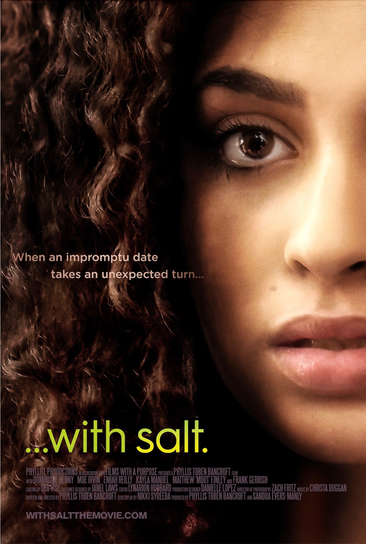 I’m even more pleased with my latest film, “…with salt.” It’s a powerful short film that deals with the self-silencing that occurs in the aftermath of a traumatic assault. In it I explore the relationship that women have with themselves and the masks that they must wear to survive in the world. This intense drama is authentically told from a women’s perspective. It is an intricate yet subtle study of predator meets prey, leaving the naive character, Natalie (newcomer Dominique Denny), confused and dismantled by Roger’s (Grey’s Anatomy’s Moe Irvin) engaging charisma and covert manipulation. The storytelling promises to spur conversation as it courageously investigates the genesis of shame in women who are survivors of sexual assault.