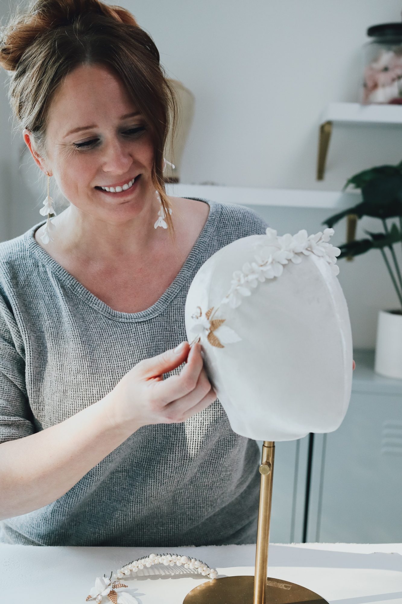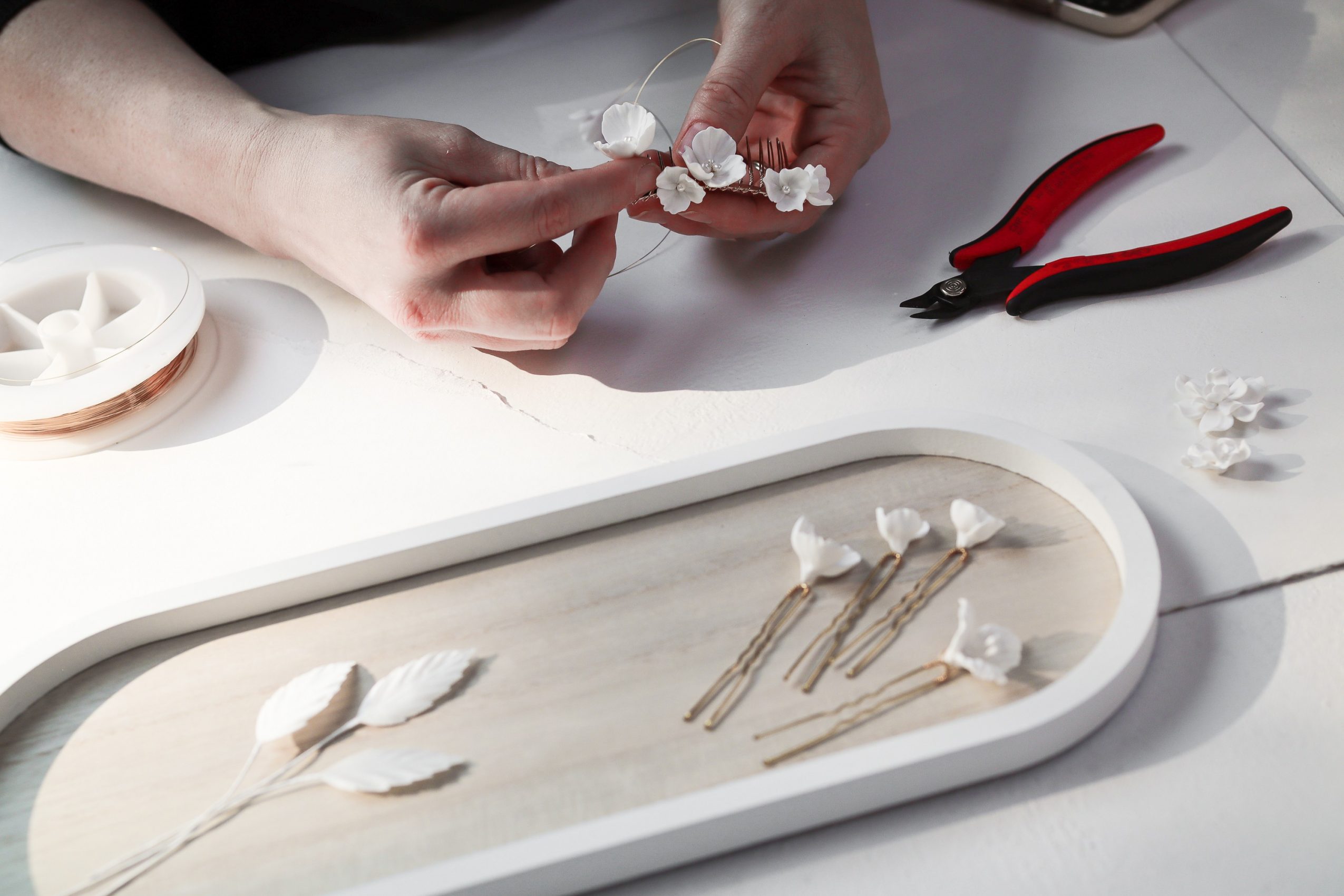 Recently I started working with polymer clay flowers and they are my current favorite component to work into styles. The finish is velvety soft and smooth, they look luxurious like a ceramic, but they’re also lightweight and easy to wear. I’ve been putting them on crowns, earrings, hair pins, hair slides… anywhere I can. I’m obsessed.
