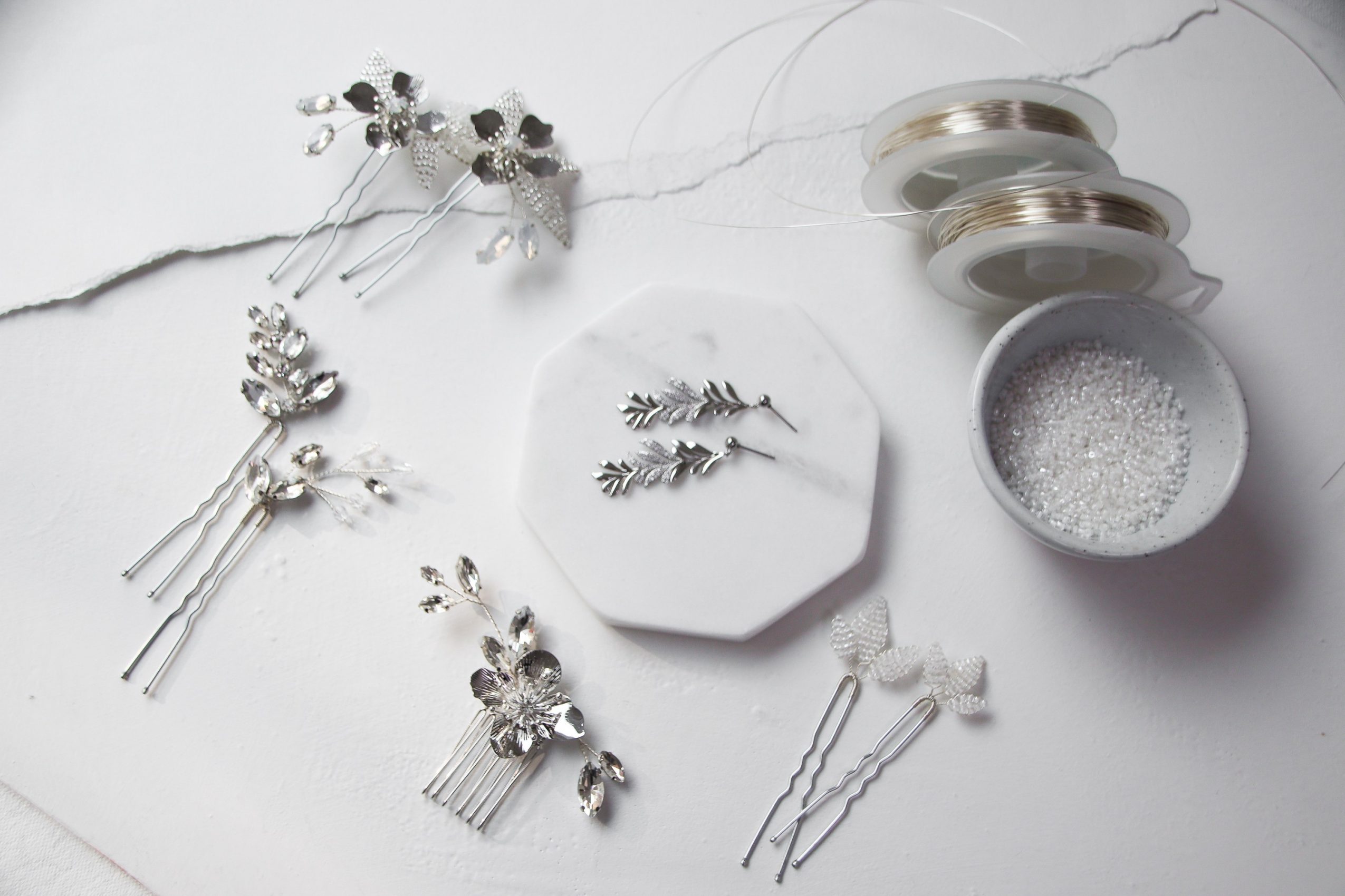 I make bridal accessories of all kinds including veils, belts, and jewelry, but I’m best known for my hair accessories. All are made by hand, and most are made with wire and an assortment of components like pearls, beads, rhinestones, and crystals. I love working with pearls. They’re beautiful and timeless. My most popular pieces all feature some sort of cluster of pearls.