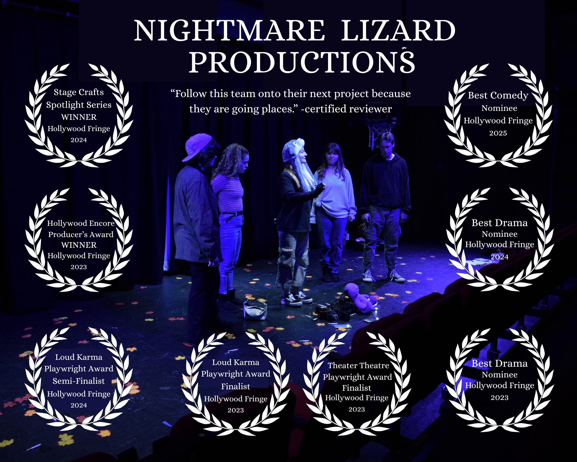 I am the artistic director and founder of a Los Angeles based theater collective, “The Nightmare Lizards,” a group of multifaceted artists specializing in creating work that is absurd, existential, and somehow, still sort of funny. I also act as the lead playwright for the collective. Since June 2023, we have staged three productions, all of which I wrote. Each production earned critical acclaim and multiple accolades, amassing a total of nine awards and nominations. Our work has been featured in over ten local publications and highlighted on two podcasts. Certified reviewers have praised our work, with one calling our sophomore piece, “Like watching an off-broadway show or a Netflix series,” and “The best play I have ever seen.” Looking ahead, we hope to tour my original script “Dinosaurs” in the coming year and to continue creating introspective, clever work. To support our endeavors, please visit nightmarelizards.com