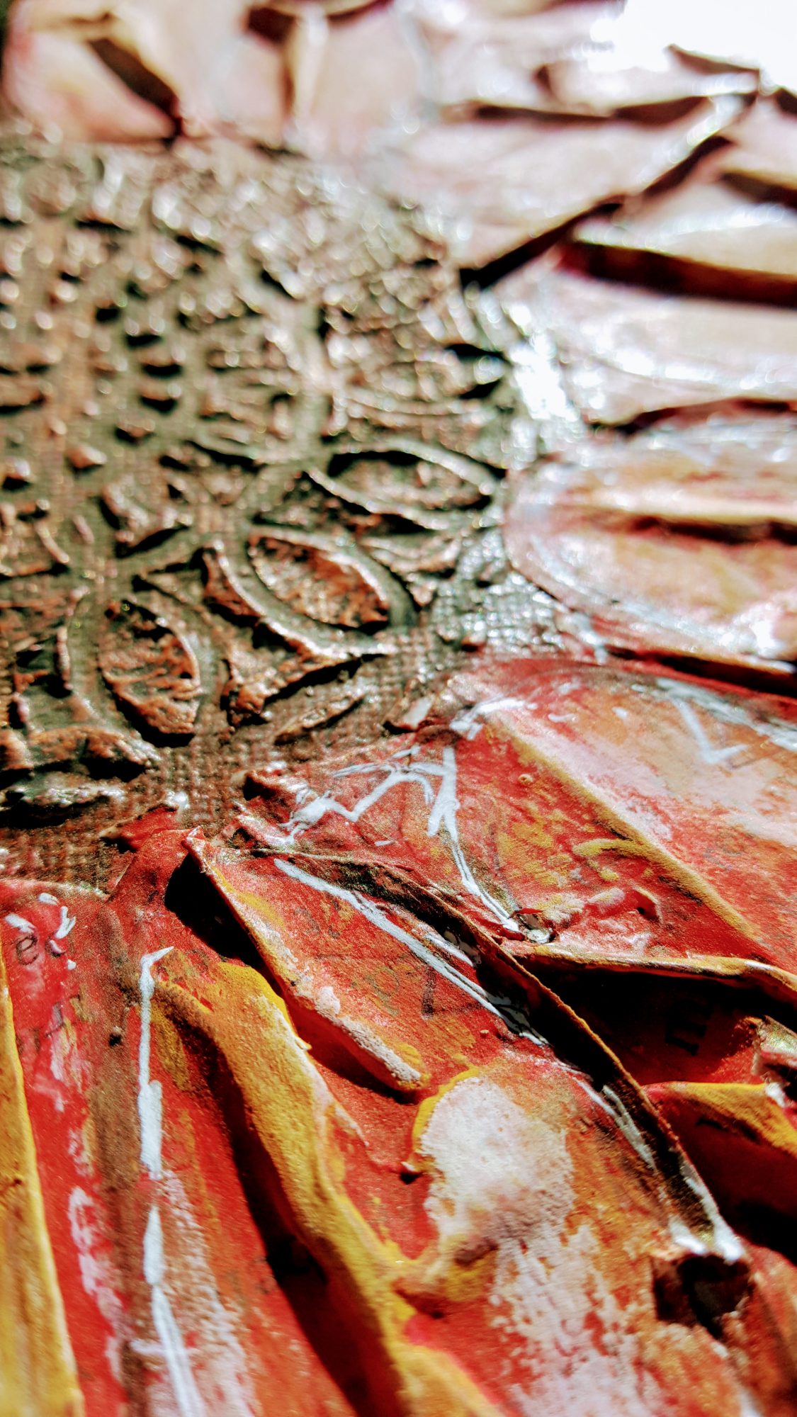 I’ve always been a mixed media artist; I just didn’t know that it was a thing. I’m into using all types of substances…paint, paper, ink, modeling paste, watercolors, oil pastels, ink sprays… I could never pick just one! I’ve always liked to mix things together to see what happens and to find different ways of using things.