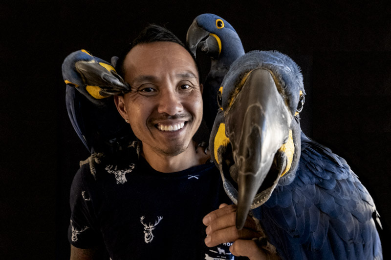 I’m Chan the Birdman and I provide training to all birds, focusing on behavior, nutrition, husbandry and free-flying. My specialty is free-flying, which is training a bird to fly and come back to you, and it’s based on the ancient survival skill and art of falconry but with a much more intelligent bird species. The ability to fly your bird and have them return to you is the ultimate expression of trust, love and respect in the animal kingdom.