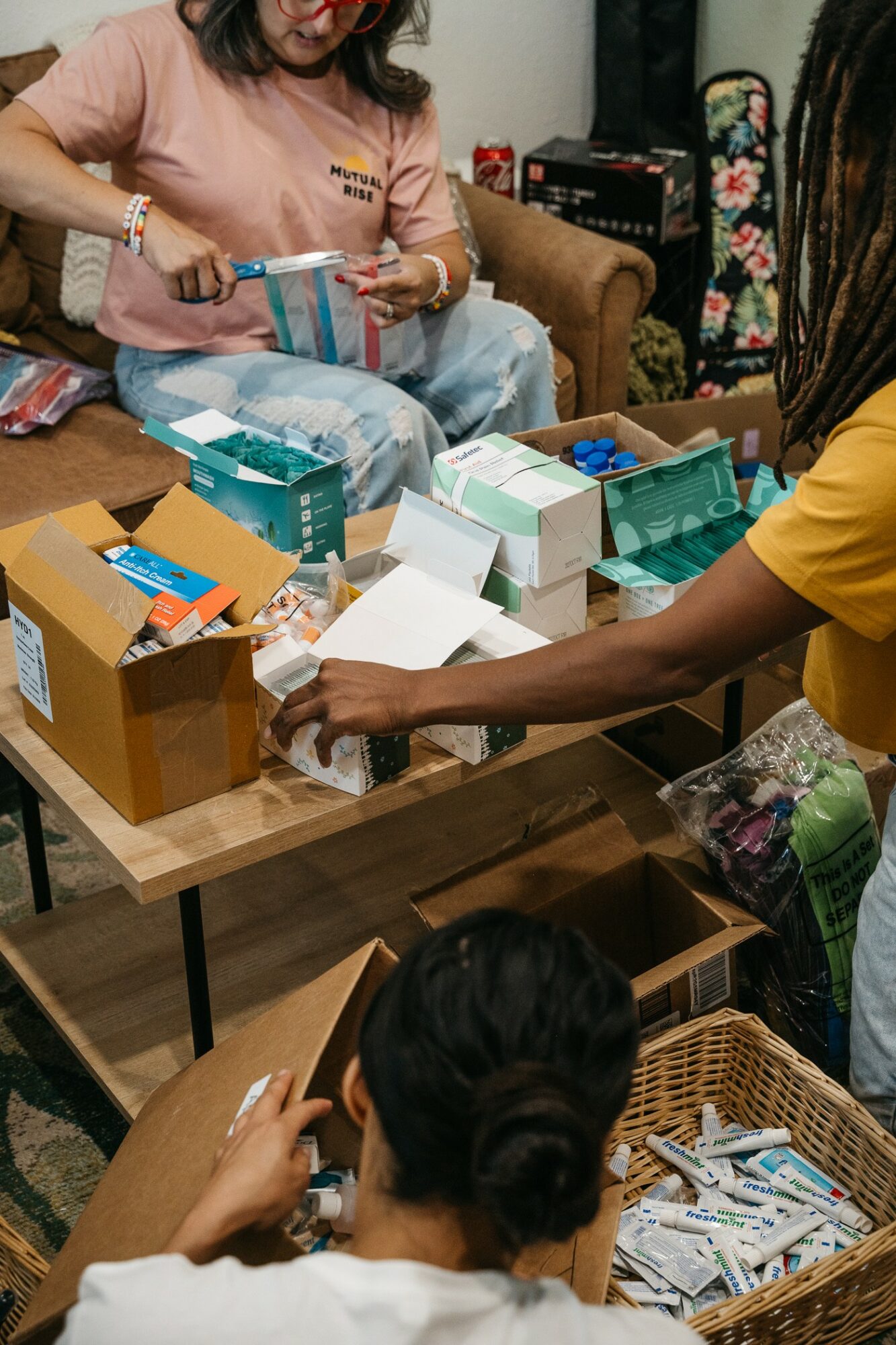 What sets us apart is that we work with nonprofits to access and secure large-scale food and essential donations from businesses and help to expand nonprofits’ reach through our own distribution channels and routes. Everything we do is powered by our small network of volunteers and nonprofit partners who gather supplies and ingredients, cook, assemble hygiene kits, and help deliver meals. We think it’s really important to build real relationships with our neighbors who need care, check in regularly, and tailor support to what people actually need.