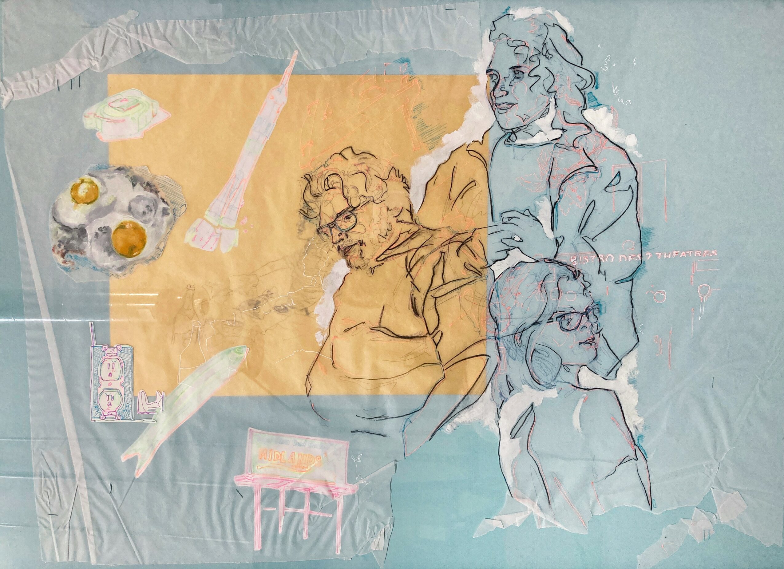 Now, my practice is really about paying attention to everyday life and giving myself space to experiment and let things change over time as I put things on canvas or on paper. I’m drawn to ordinary, often overlooked objects and moments, and I build layered, collage-like compositions that are shaped by my design background.