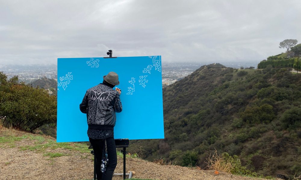 Now for the art. Each location chosen was specific and conscious. I set the intention that each artwork be activated by the energetic signature of that specific area. For example, at dawn on Christmas morning, I selected a mountain top on Runyon Canyon. Viva LA didn’t hesitate to drive the huge art truck to location & help me set up & film the experience. It was magic, humming birds flew around me, and clouds formed a portal around me as a drew. Then, that Christmas evening, at magic hour, Viva LA drove me to the Griffith Observatory & I drew a new artwork that matched the color of the sunset.