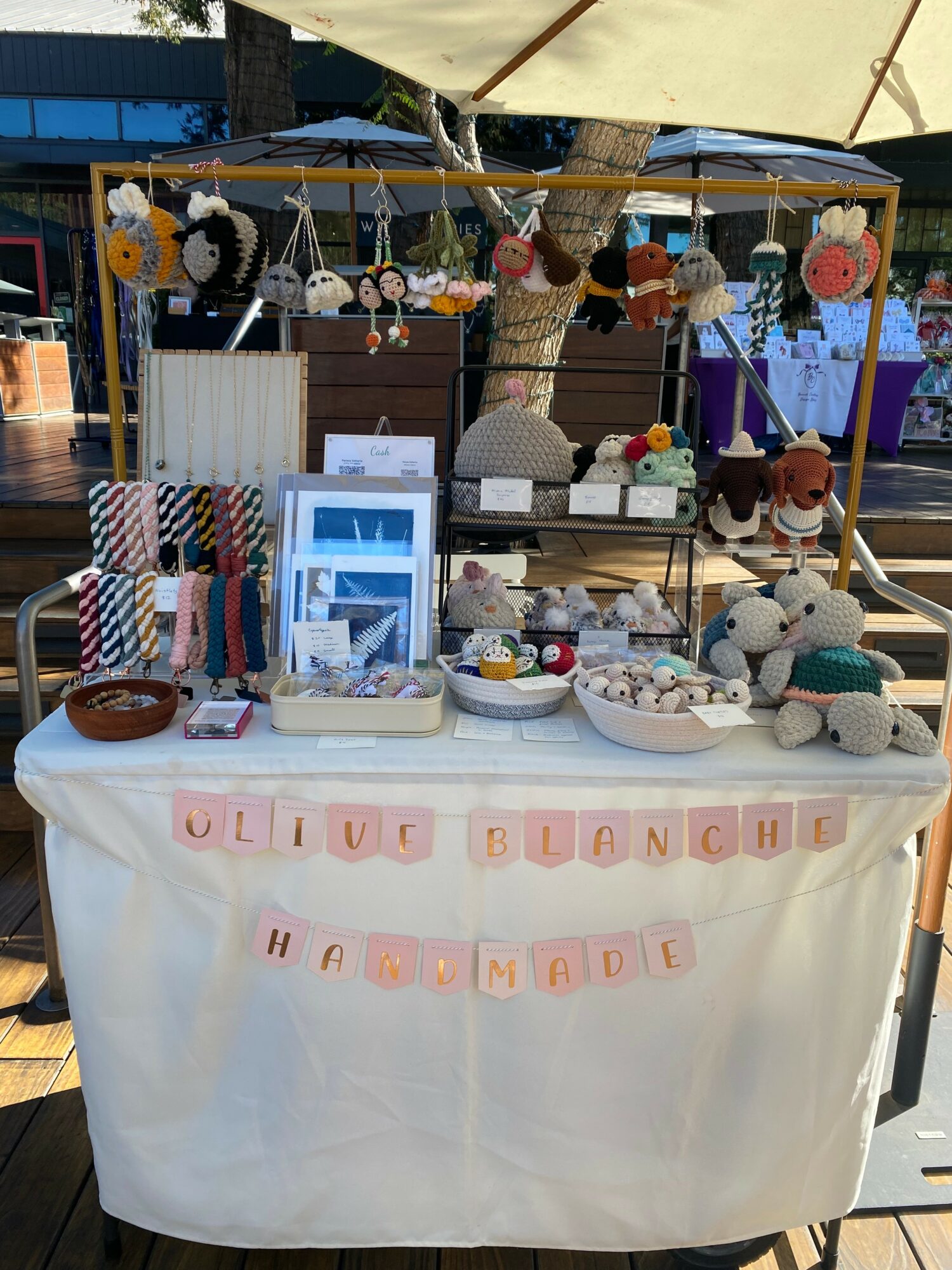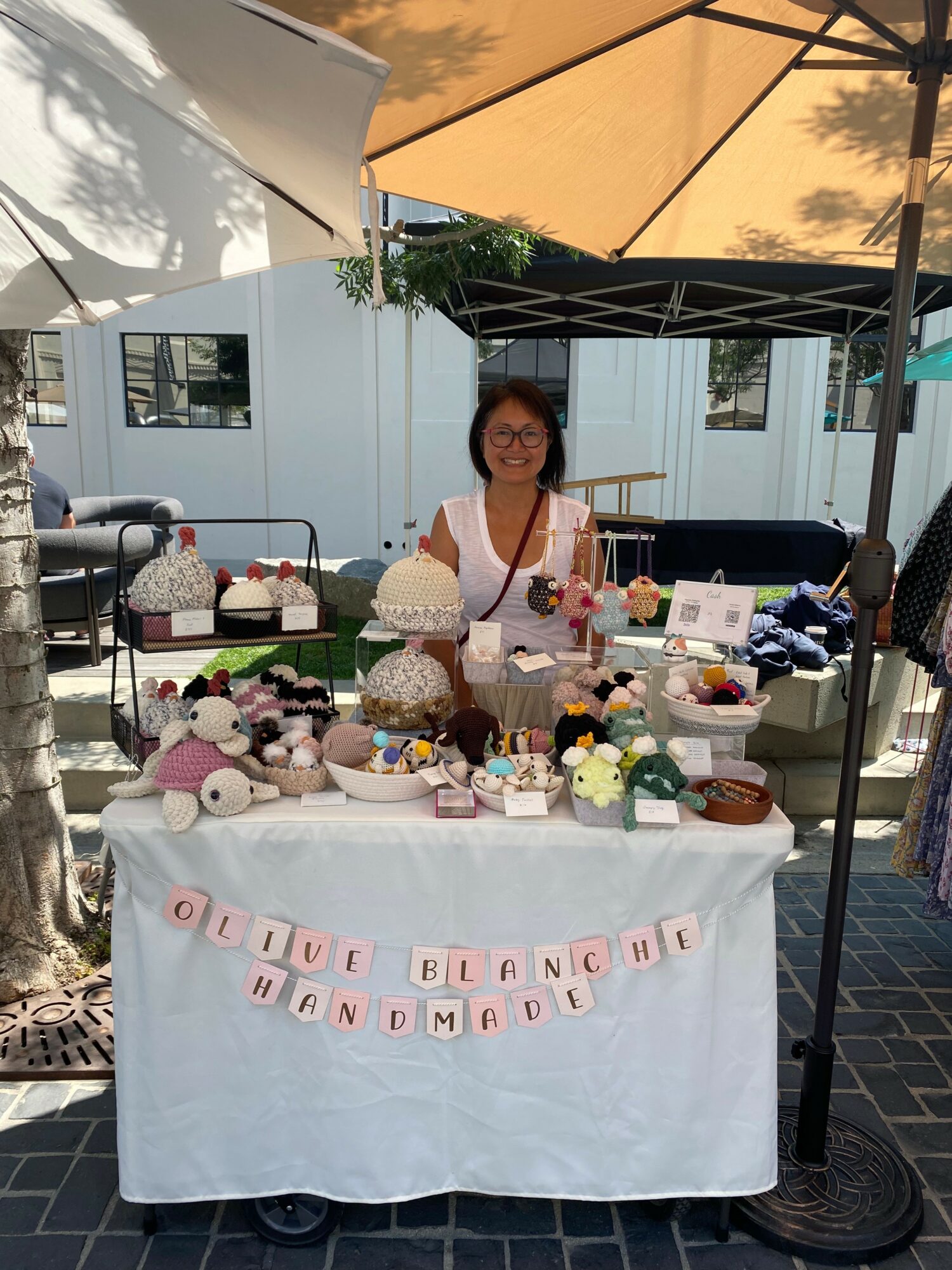 It was towards the end of 2023 when I saw a cute chicken pattern online that I decided to make it and gift it to my niece. Then I had a lot of yarn left over and decided to make as many as I can, and thought i can find a small, local pop up market and try to sell them. Before I could do that, I had to come up with a name, and I came up with “Olive Blanche Handmade”. Its name comes from the love of my niece Olivia and the love of my dog Blanche (who recently passed away last year). So it was December when I was a my first market and the chickens were a hit. I sold about all of the ones I made, along with a few ornaments.