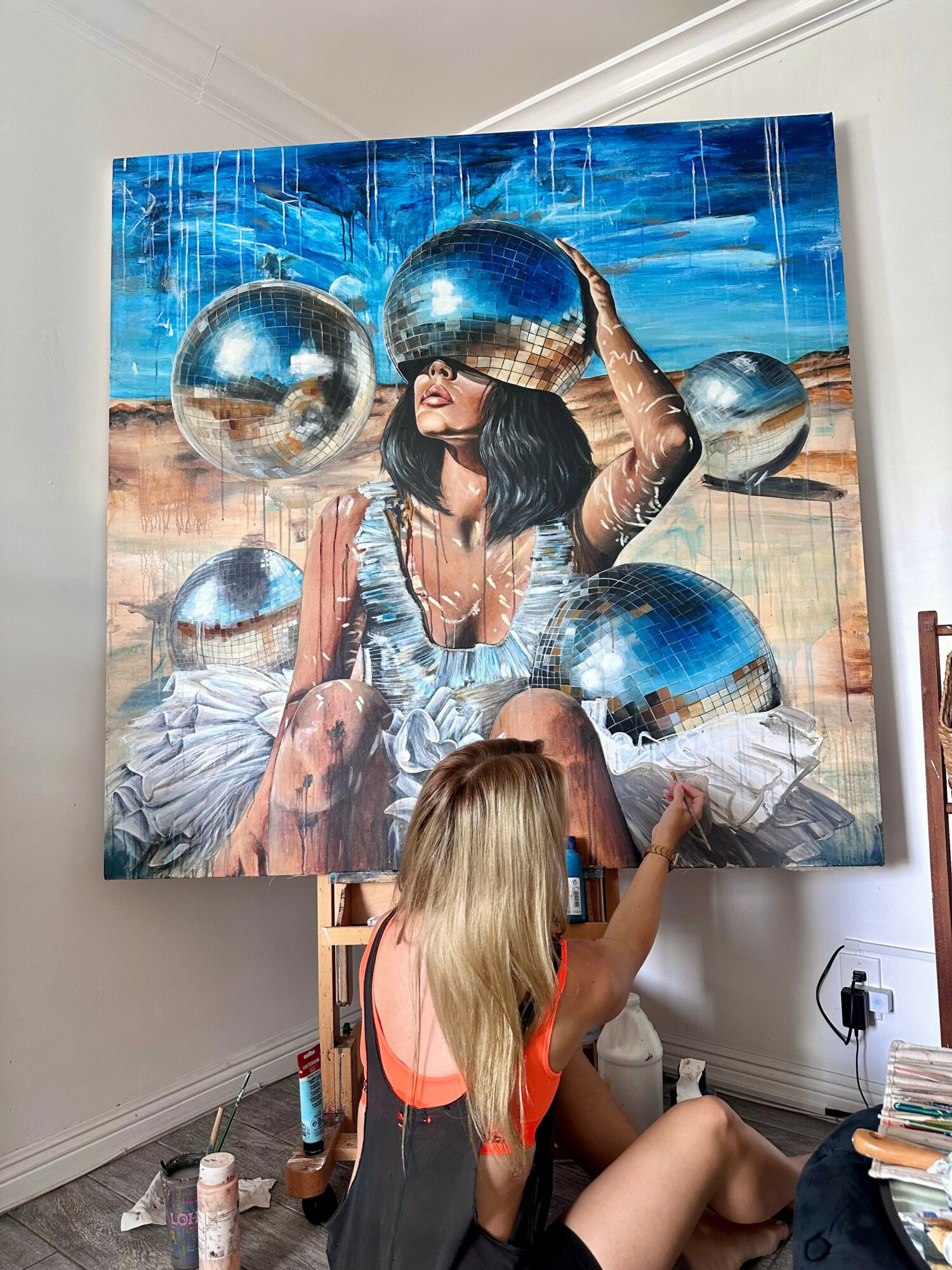 I create large, expressive paintings that are both dreamlike and grounded in emotion. They reflect the world we live in and the inner worlds we often hide. And honestly? I paint because it’s the most real version of me I’ve ever been.