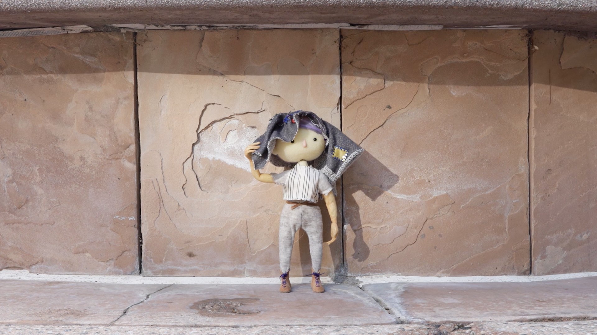 My most recent film “Under A Shooting Contrail” (2022) is a puppet stop-motion that is shot outdoors. Usually, stop-motion is shot under controlled lighting in dark studios, and animators don’t get to see sunlight for a long time. I really liked being in a stop-motion studio, but I also really missed being outside, so I thought, “What if I animate a puppet outside?” I wanted to bring uncontrollability and serendipity to stop motion. The result was very fun and rewarding — the puppet exists at a different speed from humans and experiences the environment differently. The environment is moving at a fast time-lapse speed while the puppet is walking at a normal speed, and I couldn’t predict how the environment changes one second later in the animation. The shadow chases and swallows the puppet, water on the pavement dries very fast, clouds move in unexpected ways, and the wind flaps the puppet’s cape every frame.