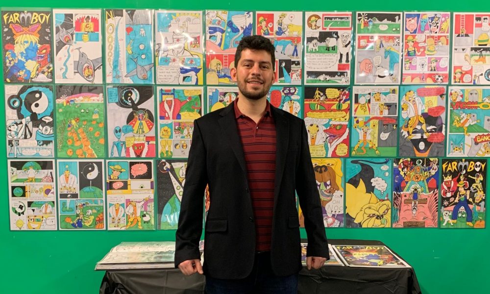 After curating many shows at one art space, I was inspired by all the colorful pieces of art and decided to rewrite and redraw FarmBoy my college comic book project in full-color thanks to the artists in the shows.