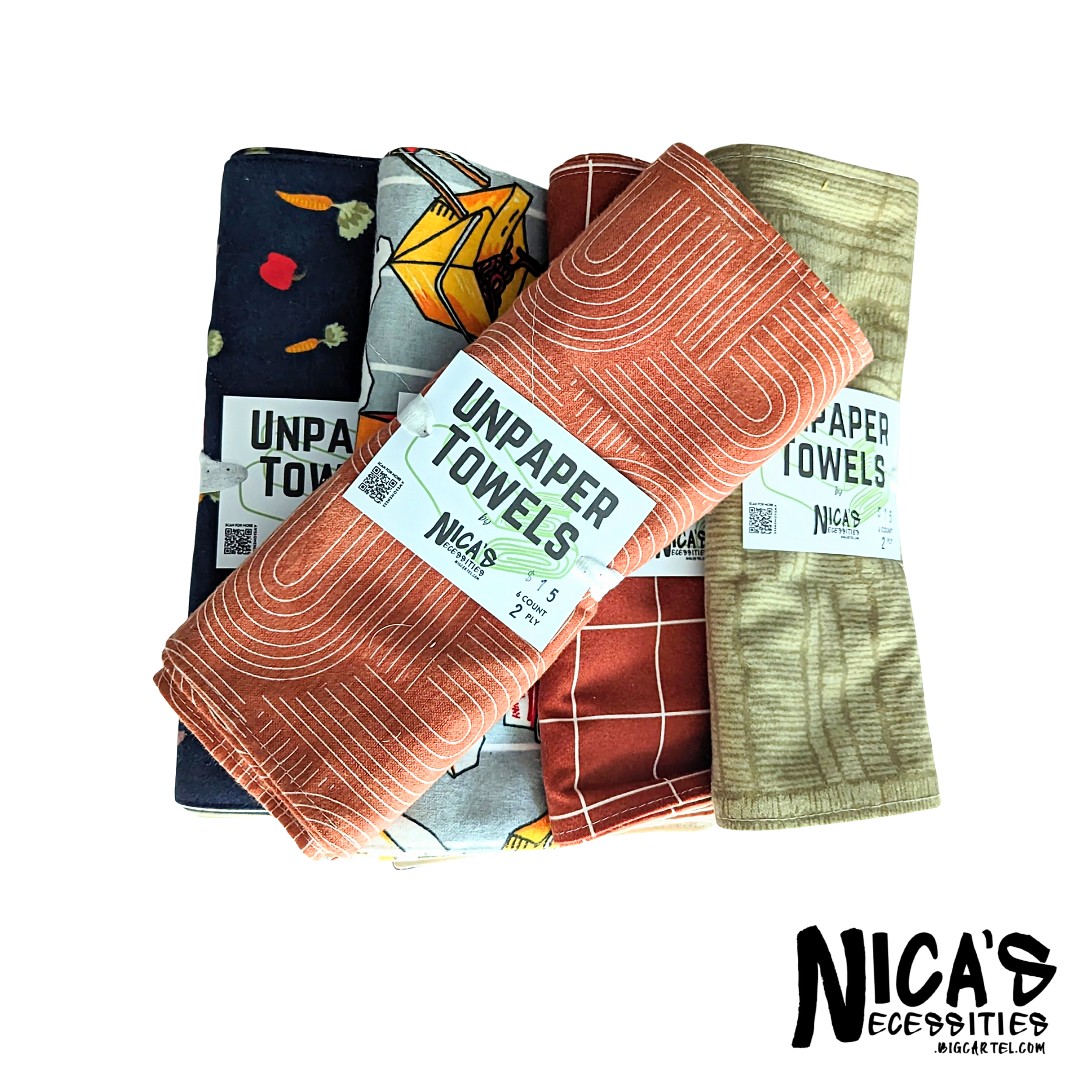 Nica’s Necessities is a handmade shop where I focus on upcycling single-use items into fun and quirky accessories, such as rice bags transformed into bucket hats, tote bags, and fanny packs. Everyone’s favorite is definitely the chip bag zipper pouches and purses, and an occasional food box or shoe box notebook filled with recycled paper. One of my labors of love is my “Unpaper Towels” and reusable Facial Cotton Pads, which are great replacements to everyday single-use items.
