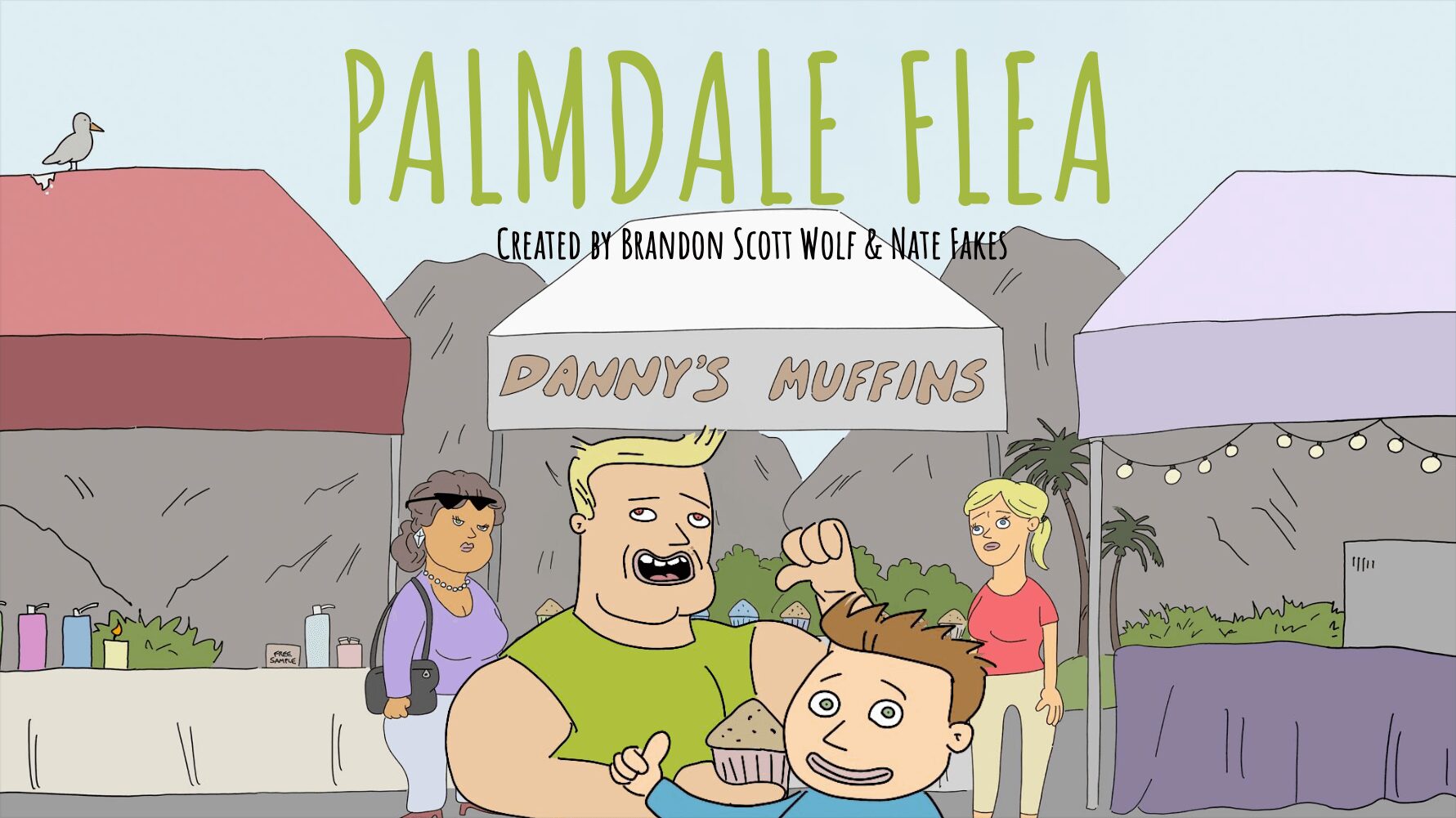 And, over the last year, I’ve consistently developed, written, produced, and voiced characters for PALMDALE FLEA, a comic strip turned adult animated series co-created by myself and amazing syndicated cartoonist and animator Nate Fakes. The series follows Danny, a himbo entrepreneur, who owns and runs a flea market muffin stand with his on-again-off-again girlfriend’s 8-year-old son, Graig, whose biggest dream is to become a coordinator at a marketing firm!