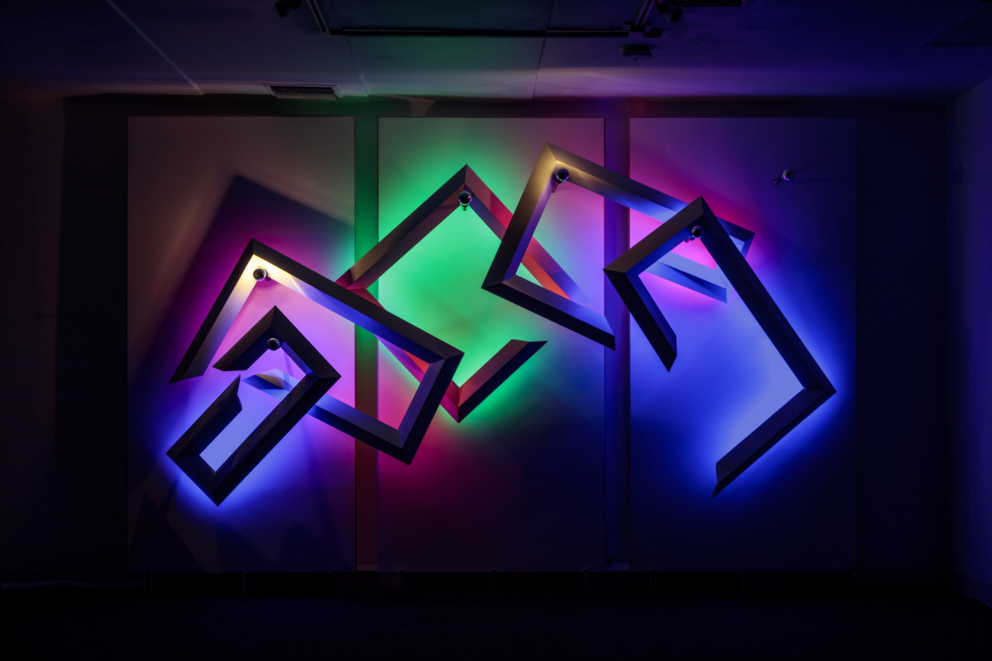 In 2022, after venturing into LED color and color blending with a wall sized piece shown in a show at TAG entitled ARTitects: Architects who Art, I designed and constructed a 10,000 SF immersive light exhibit in a former fashion photo studio. Here, I melded “light art” in an architectural scale much in the realm of Light and Space movement. Entitled “Color Fields”, five distinct exhibits put visitors in a walk through within an interactive color saturated experience, each part playing on different concepts/experiences.