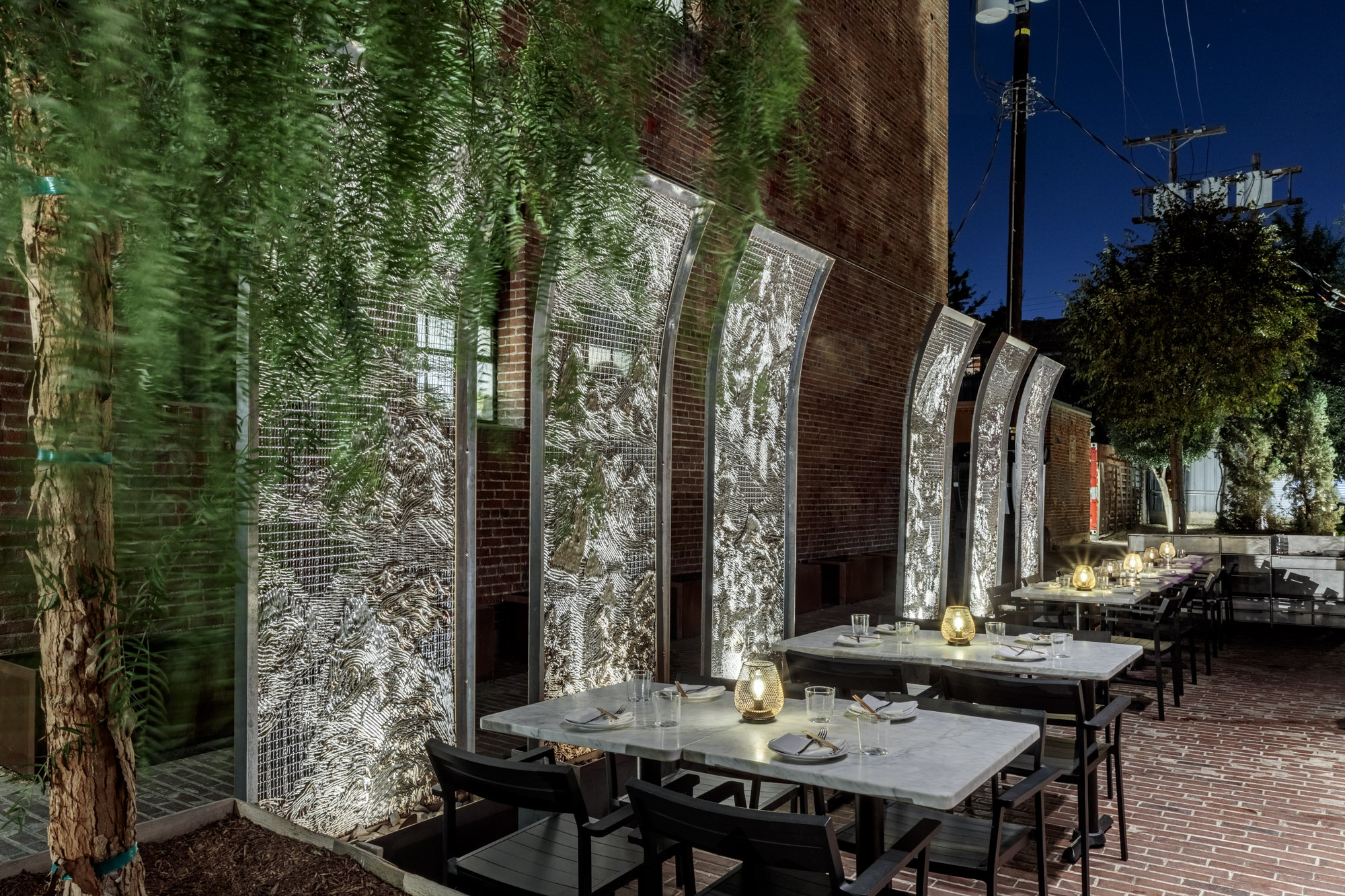 While I have a keen love for a few of my projects, I think I am most proud of my installation at Yangban Restaurant located in the Arts District of DTLA. I was initially asked by a friend to propose a lighting feature to give the off-street courtyard entrance added notice. After getting further into the plans, we realized the exterior eating area needed added definition and boundaries (it was a shared space). We needed to extend the interior out, and it still feel integrated and cohesive with the interior design. Here, I tapped an artist/architect mentor, Tomas Osinski who had invented a CNC machine for the Eisenhower Memorial “tapestry” in Washington D.C. I was the designer on the project at Gehry when this tapestry was developed; a wire mesh netting of stainless steel cable that is laid out and welded into controlled patterns to create imagery. Tomas allowed me to rent his shop to fully fabricate 12 freestanding steel panels, that are used as boundary screen walls to frame the eating area. The panels, using visual aspects of Seoraksan National Park in Korea show low resolution mountains, valley’s, trees, and rivers rendered in stainless steel cable and lit from below within its planter box base. This is the first project where I feel all of my past experience, skills, and interests both design and technical came together well into one fabulous project.