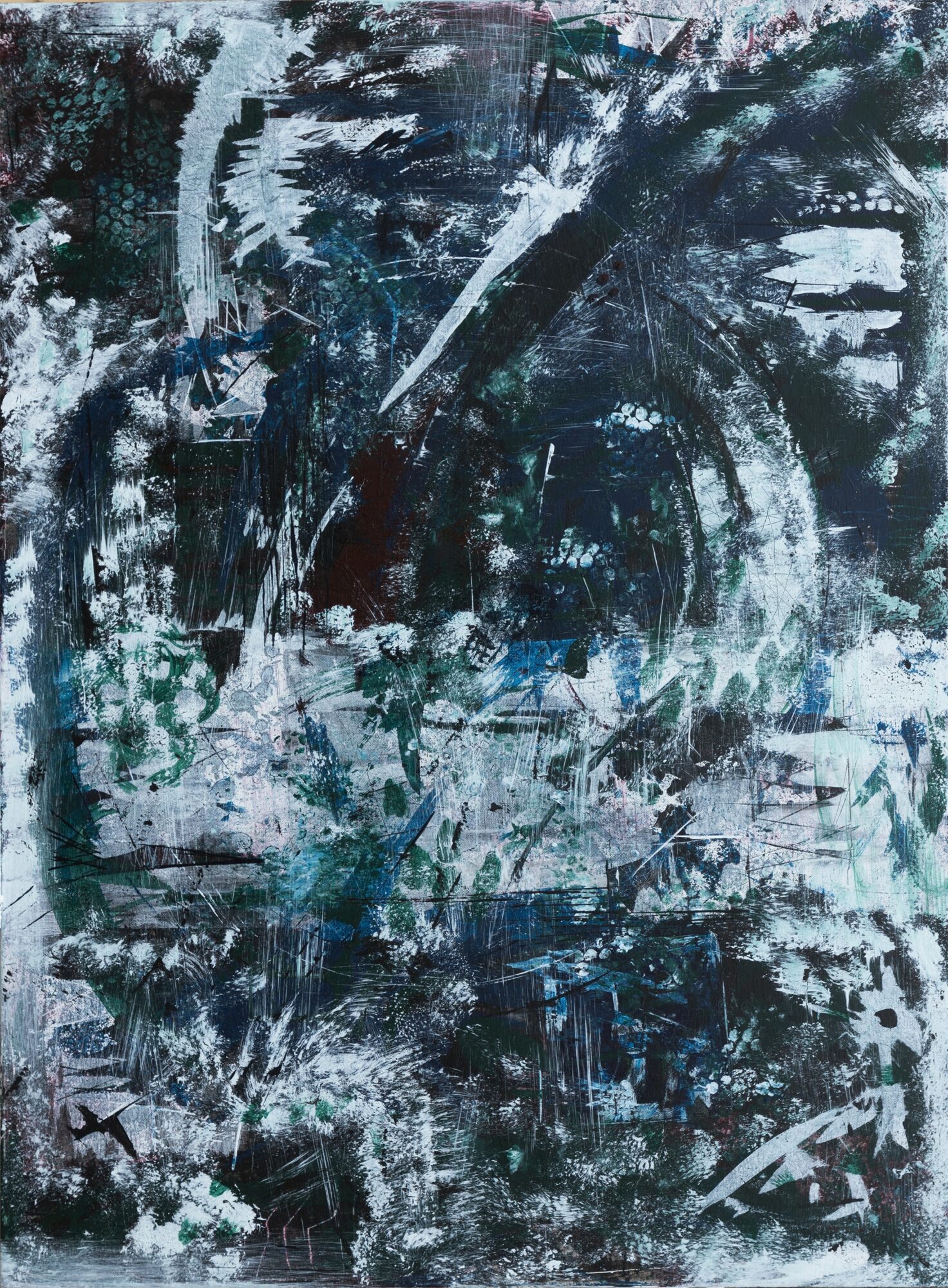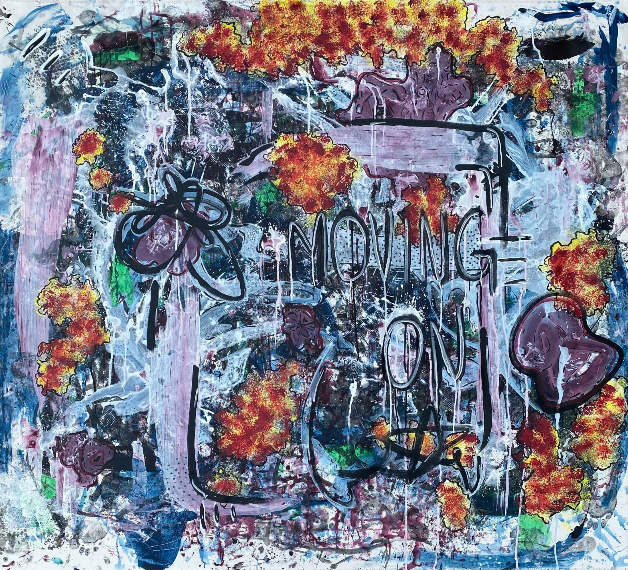 Visually, my work is raw, abstract, and heavily layered—built on movement, texture, and the tension between control and spontaneity. I work mostly on large-scale canvases and often paint on the floor so I can move around the piece and interact with it physically. I use nontraditional tools—things like skewers, bubble wrap, found materials—to create mark-making that’s unpredictable and tactile. That’s something people tend to notice right away: the depth and variation in texture. There’s a sense that the surface has a history, like it’s been weathered or lived in.