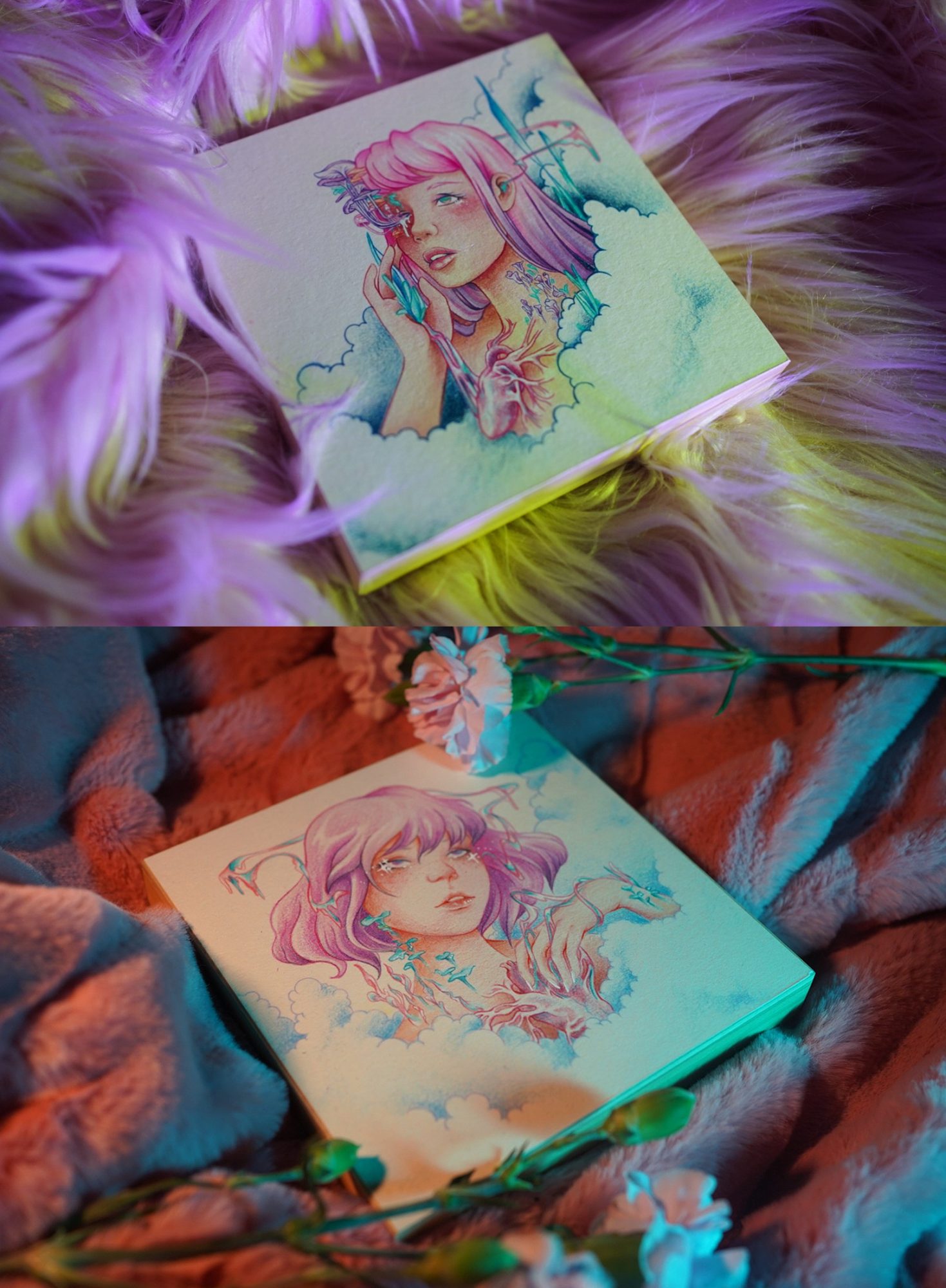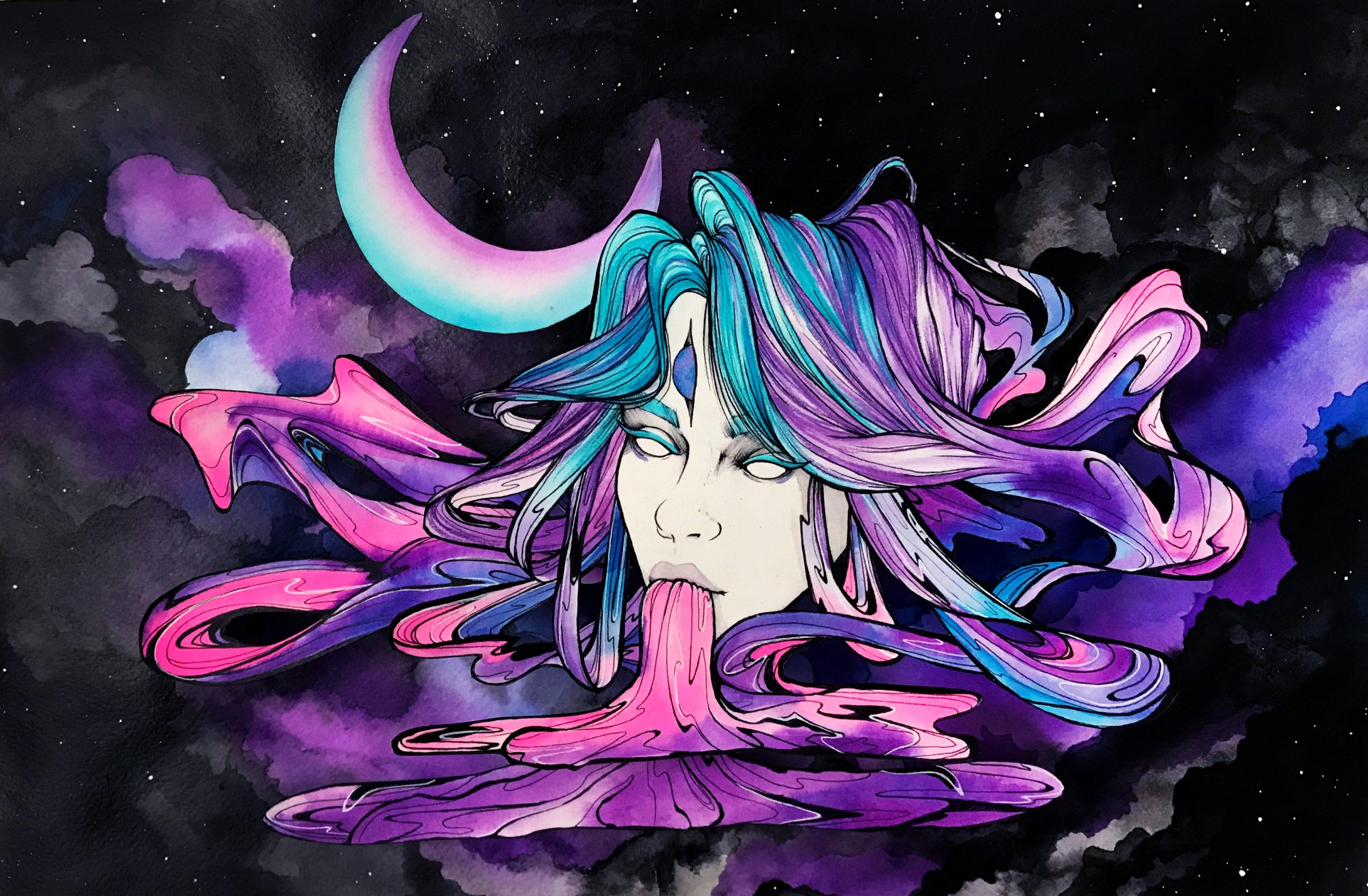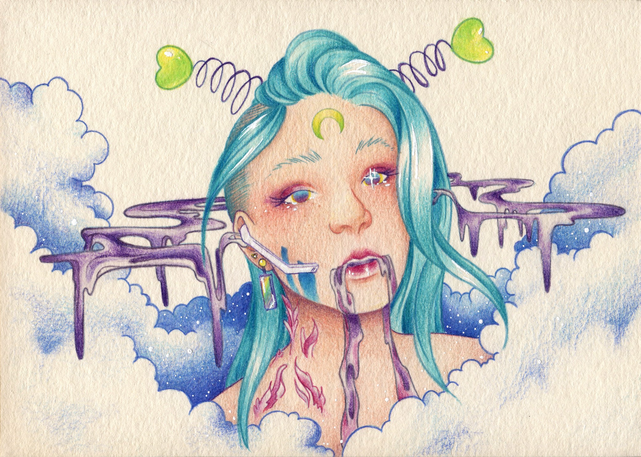 My inspiration draws from the striking line work and visual storytelling of Art Nouveau posters and Japanese Ukiyo-e pieces. However, my drawing style is heavily influenced by my love for animation and sequential art, with a particular affinity for the mahō shōjo or “magical girl” genre. The ethereal and whimsical character designs, colorful, dreamy aesthetics, and fantastical worlds and stories central to this genre all come together to produce my unique illustrative approach to contemporary surrealism movements.