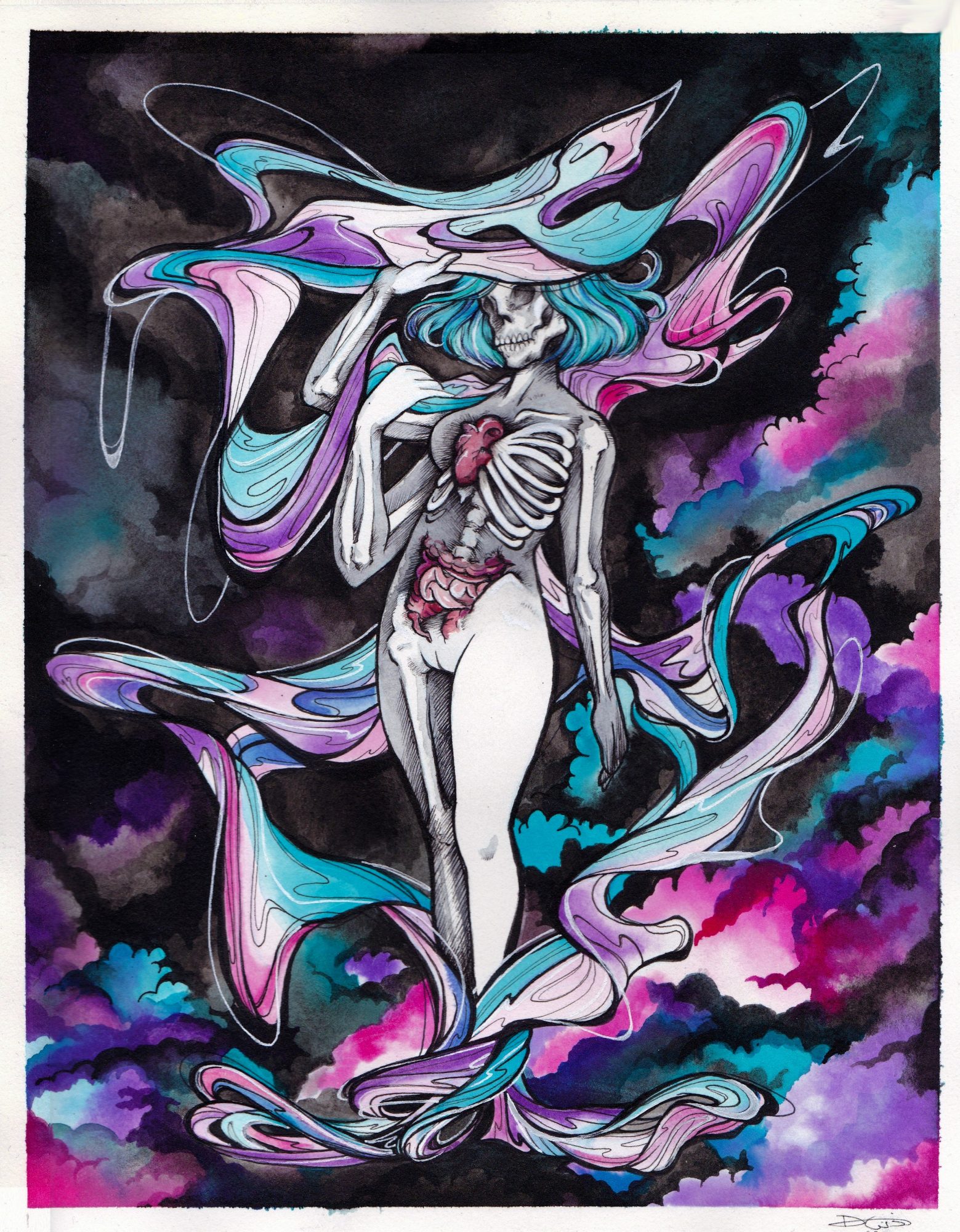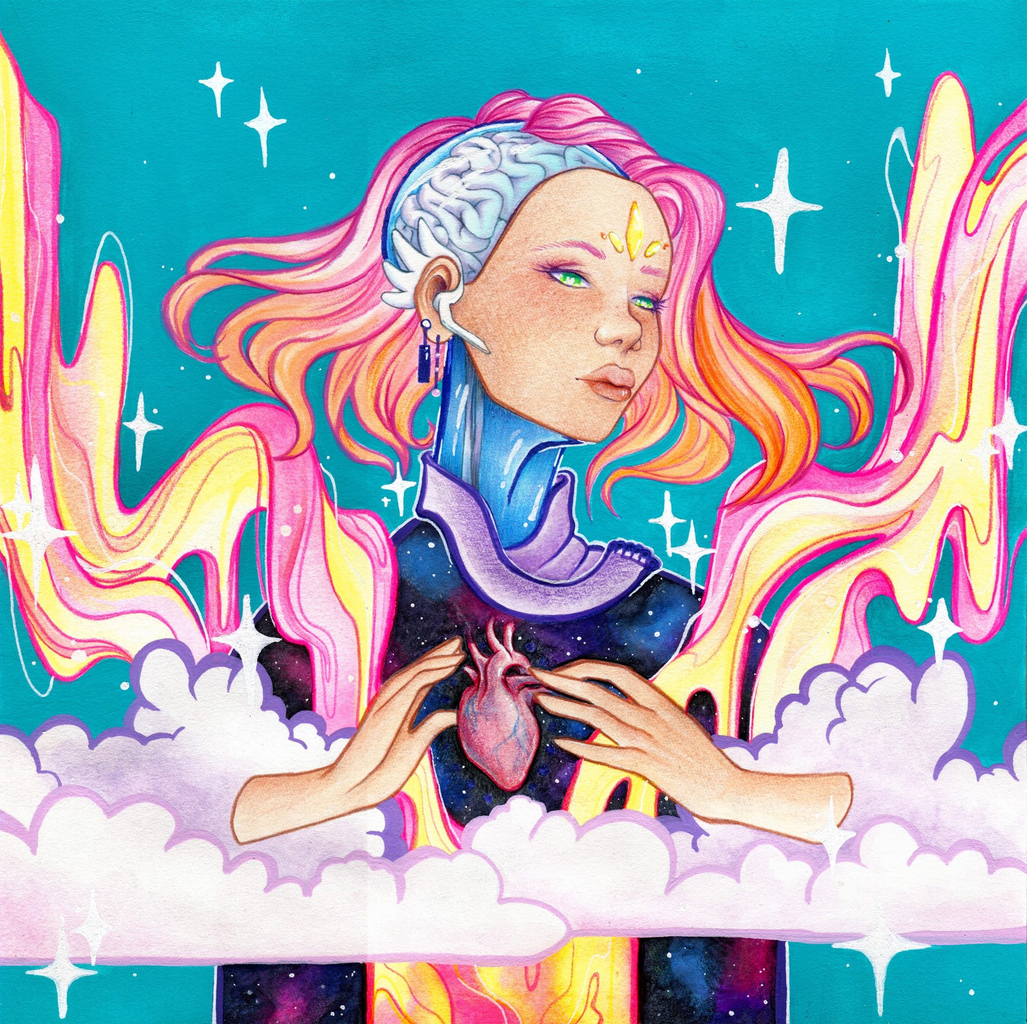 My work is primarily character-driven, and the figures that I depict are often enigmatic, existing in alternate realities that are both familiar and otherworldly. One common characteristic of these figures is that they often have parts of their skeleton or bodily organs exposed, primarily the brain or heart. These visual suggestions appear just beneath the surface of their skin, if not bursting out from their bodies, adding a layer of intrigue and symbolism to my art.