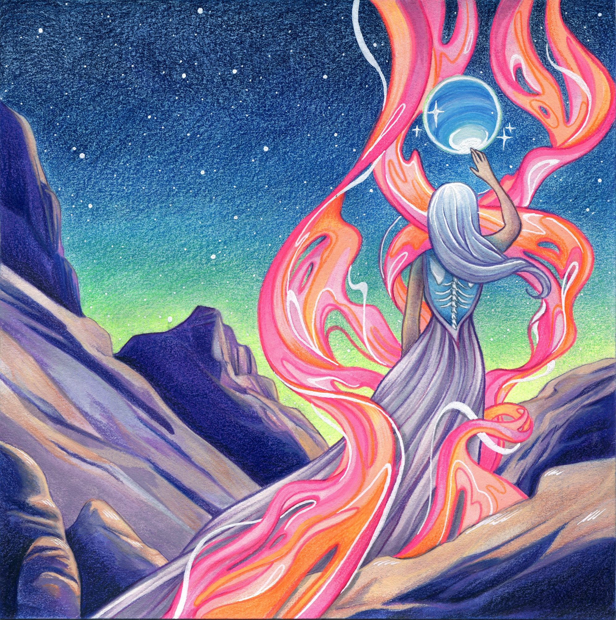Currently focusing on my personal art practice. My artwork explores the mysteries of the human condition, futurism, and our connection to the universe. I delve into concepts such as love, time, and existence, often depicting mystical figures hovering in celestial landscapes.