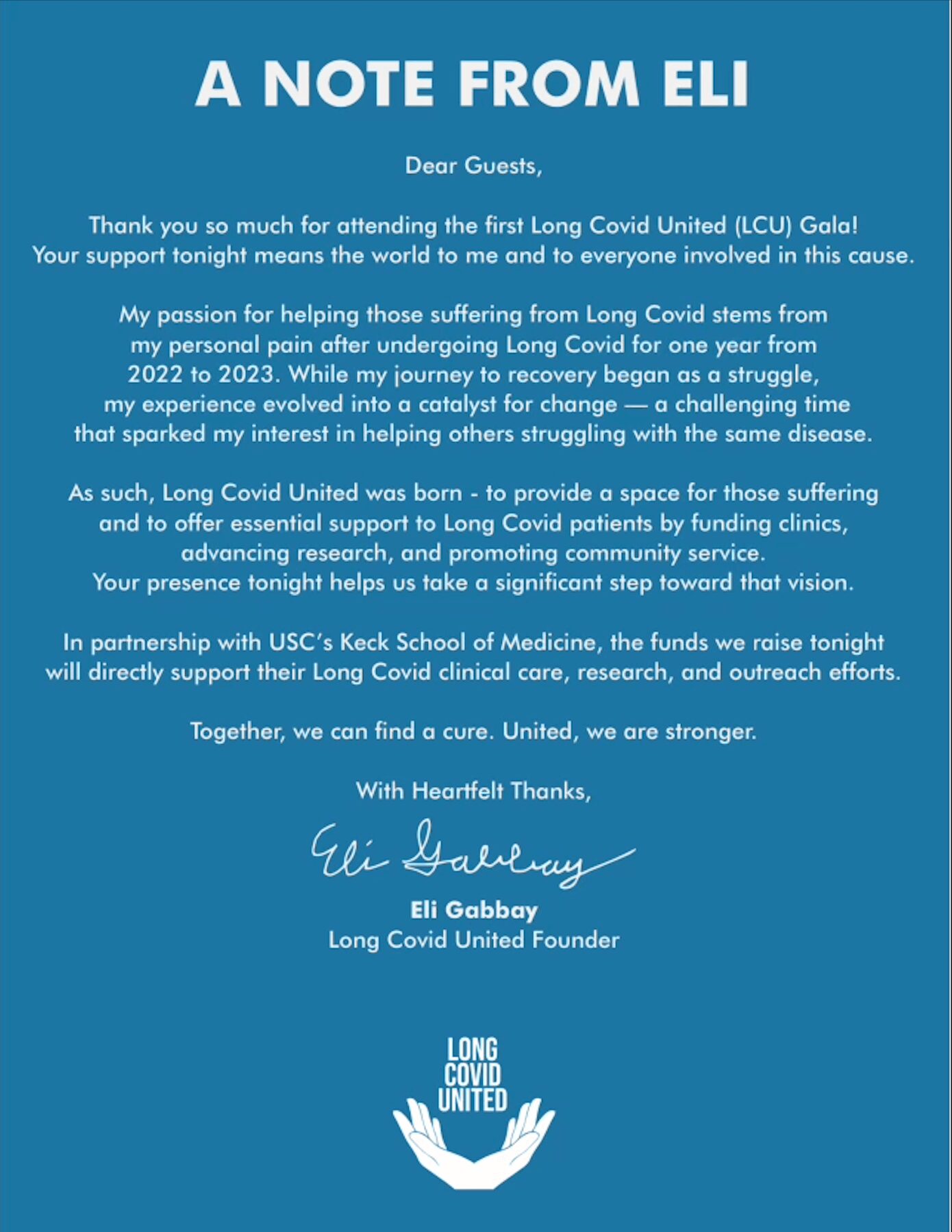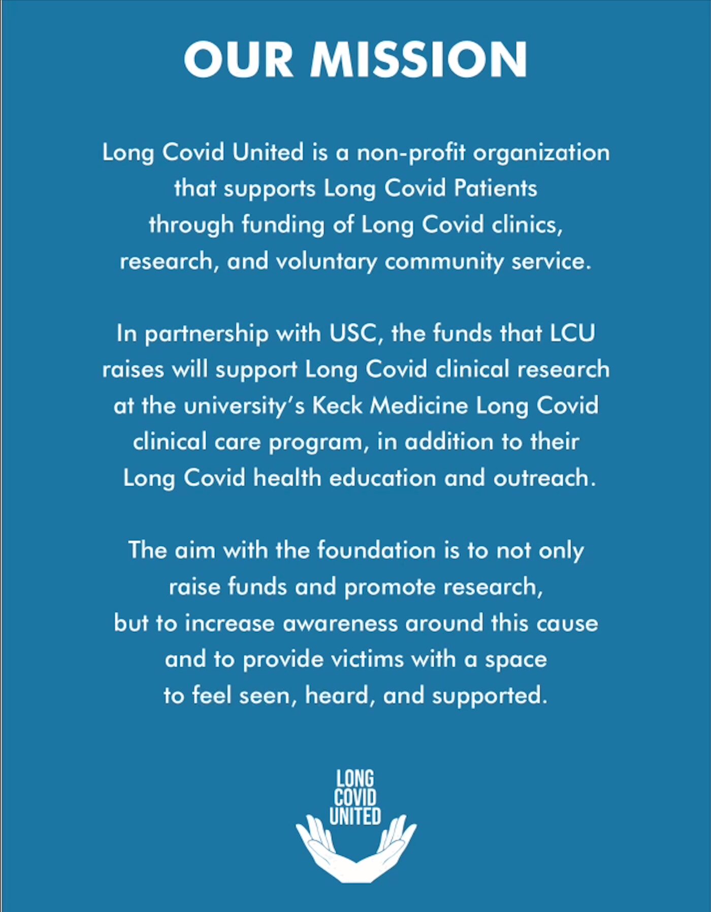 Long Covid United is a non-profit organization that supports Long Covid Patients through funding of Long Covid clinics, research, and voluntary community service. In partnership with Keck Medicine of USC, the funds that LCU will raise will support Long Covid clinical research at Keck Medicine of USC, Long Covid clinical care at Keck Medicine of USC, and Long Covid health education/outreach. My aim with the foundation is to not only raise funds and promote research, but to increase awareness around this cause and to provide victims with a space to feel seen, heard, and supported.