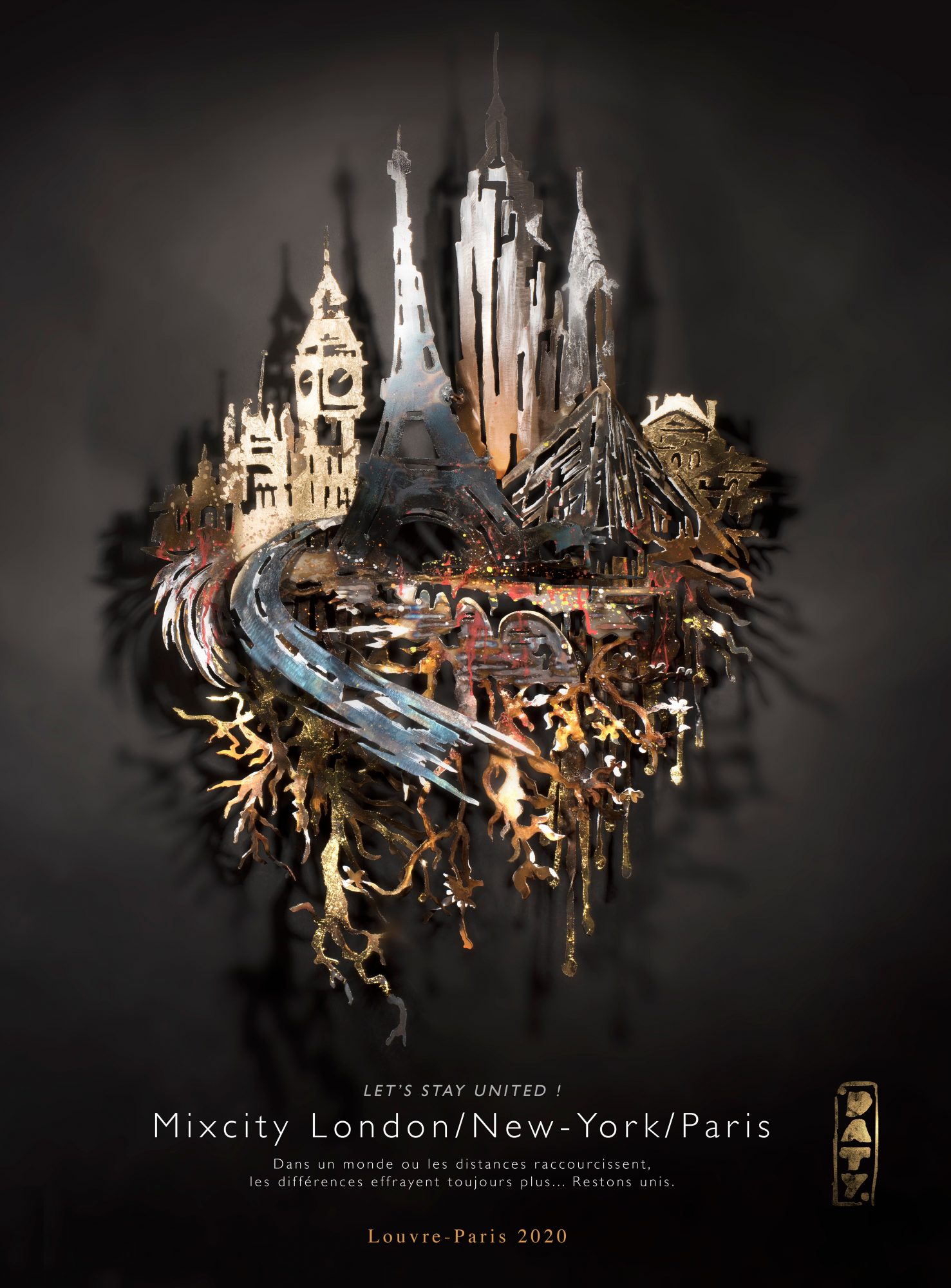 Invoking the surrealist world of Hieronymus Bosch, the symbolism of Gustave Moreau or the engravings of Gustave Doré, drinking from the illustrators of heroic-fantasy and science fiction (Moebius, Jodorowsky), fascinated by the light effects of the shadow theater Chinese PiYing, the kinetic art of Tinguely or Shun Ito and playing with perspectives in the manner of an Escher or modern 3D shooting techniques, it plunges us into a world of bubble cities, cities and towns. Roots, from Birdviews where our reality is stylized, distorted, emptied of everything that makes life.