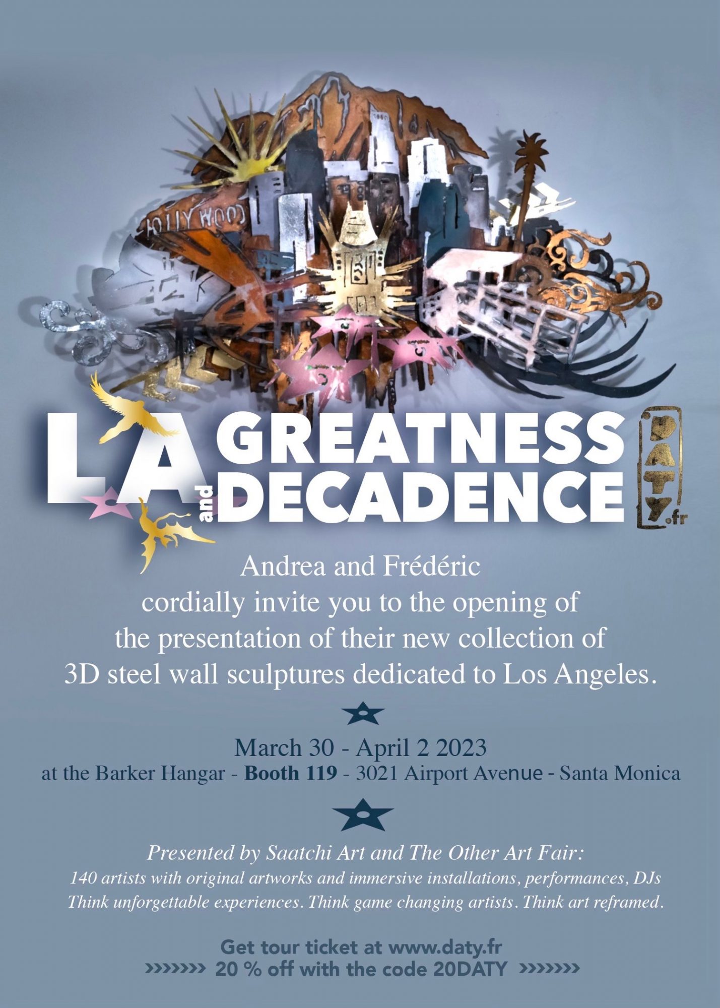 They got married during the pandemic and even during the confinement. It was proof that even in dark dark times, sparks of ignited beauty effloresce. As the collections began to grow the inspiration expanded and the evolving DATY collection: LA Greatness and Decadence was born. Andrea had imparted her love of Los Angeles to Frederic and they knew that an important collection would emerge. Daty was very excited to be working as a husband and wife team to unveil LA Greatness and Decadence at The Other Art Fair in Santa Monica on March 30th-April2nd 2023 at The Barker Hangar.