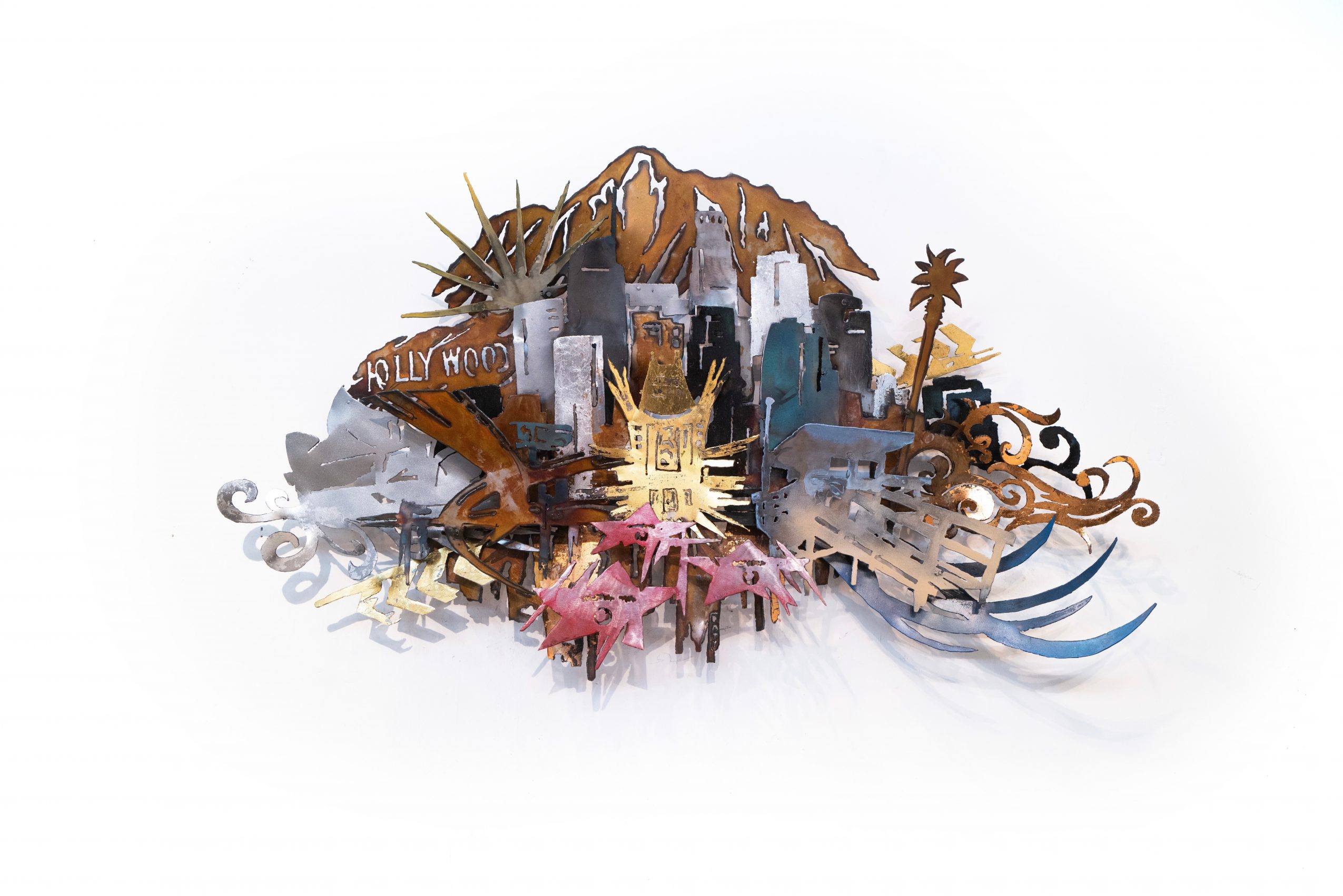“There are always three elements to my work: the metal symbolizing Mother Earth, the stylized figurative shapes representing the spiritual realm, and the light and shadows that evoke movement and change.”