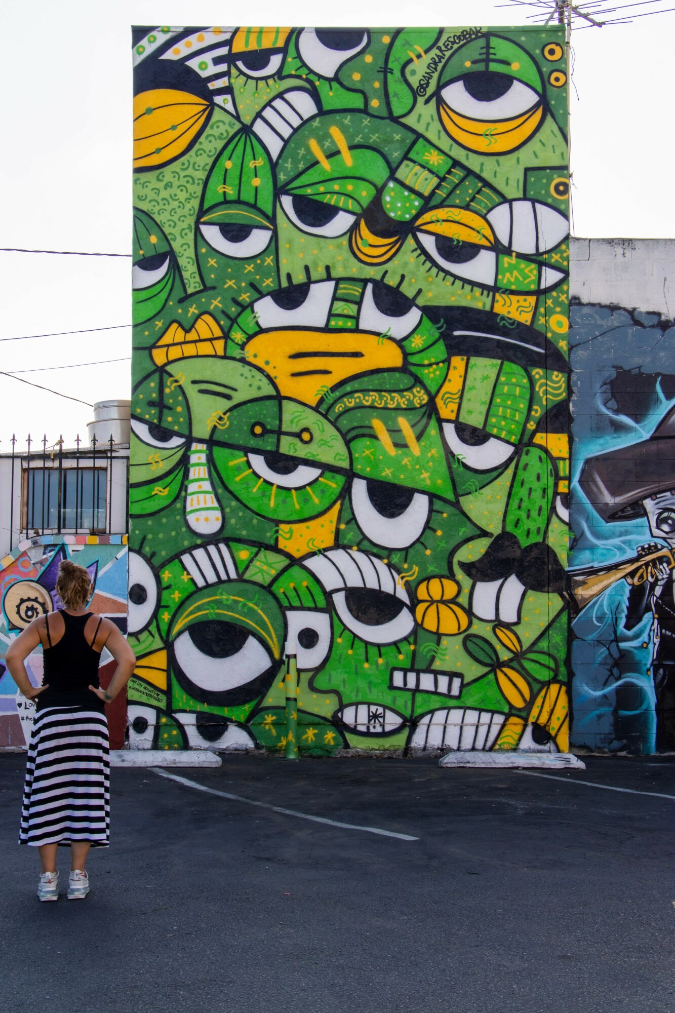 Her artistic universe is a vibrant chaos—crowded with curious figures, visual humor, strange symbols, and layered storytelling. Whether working on canvases, murals, hand-tufted rugs, ceramics, or nationwide brand activations, her goal remains consistent: make people smile through colorful chaos. She invites audiences to get closer, discover the details, and find delight in the unexpected.