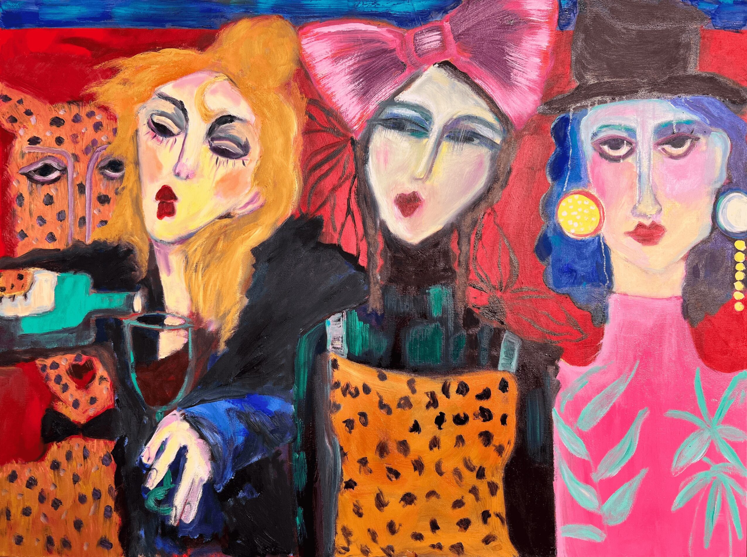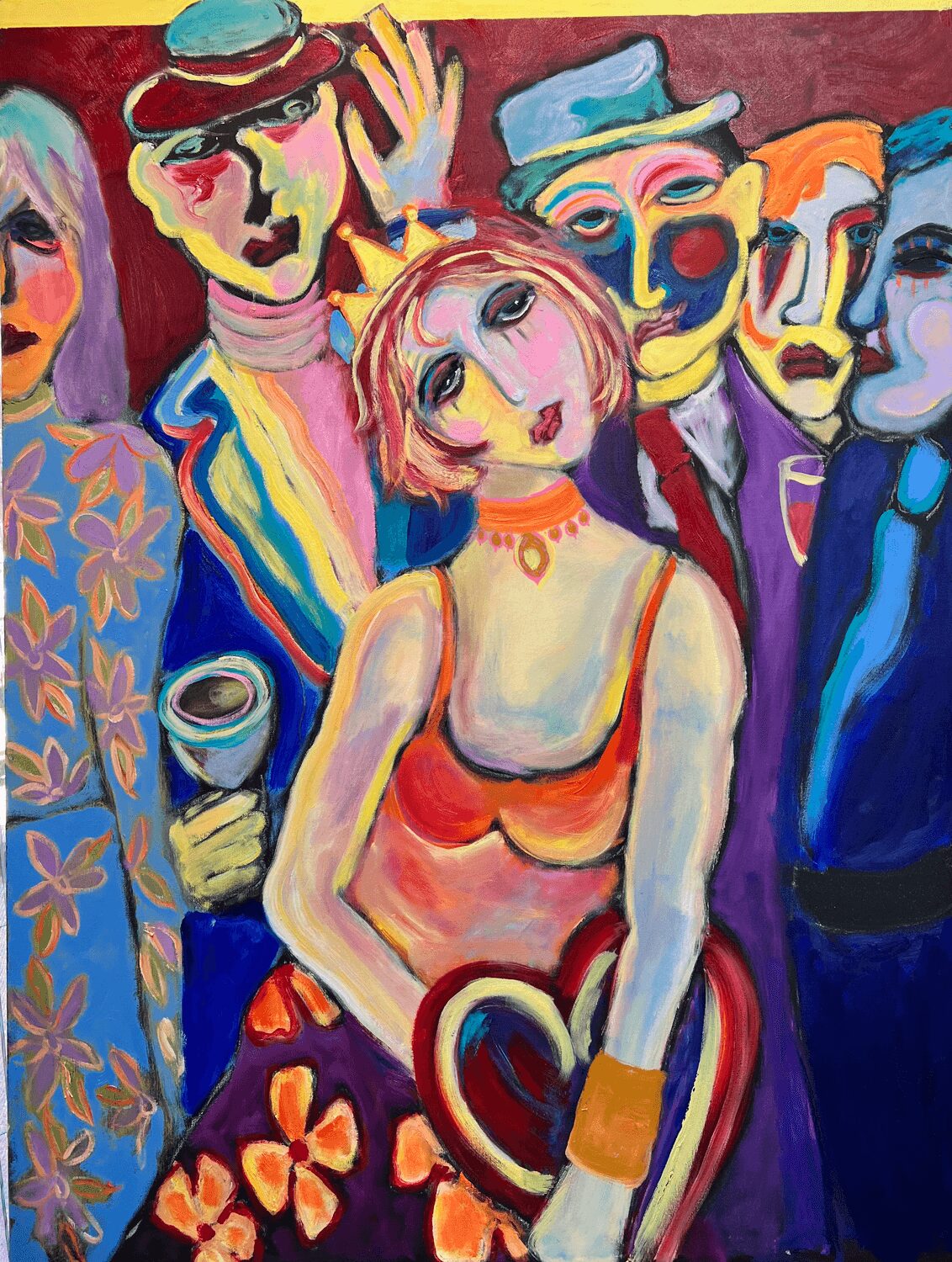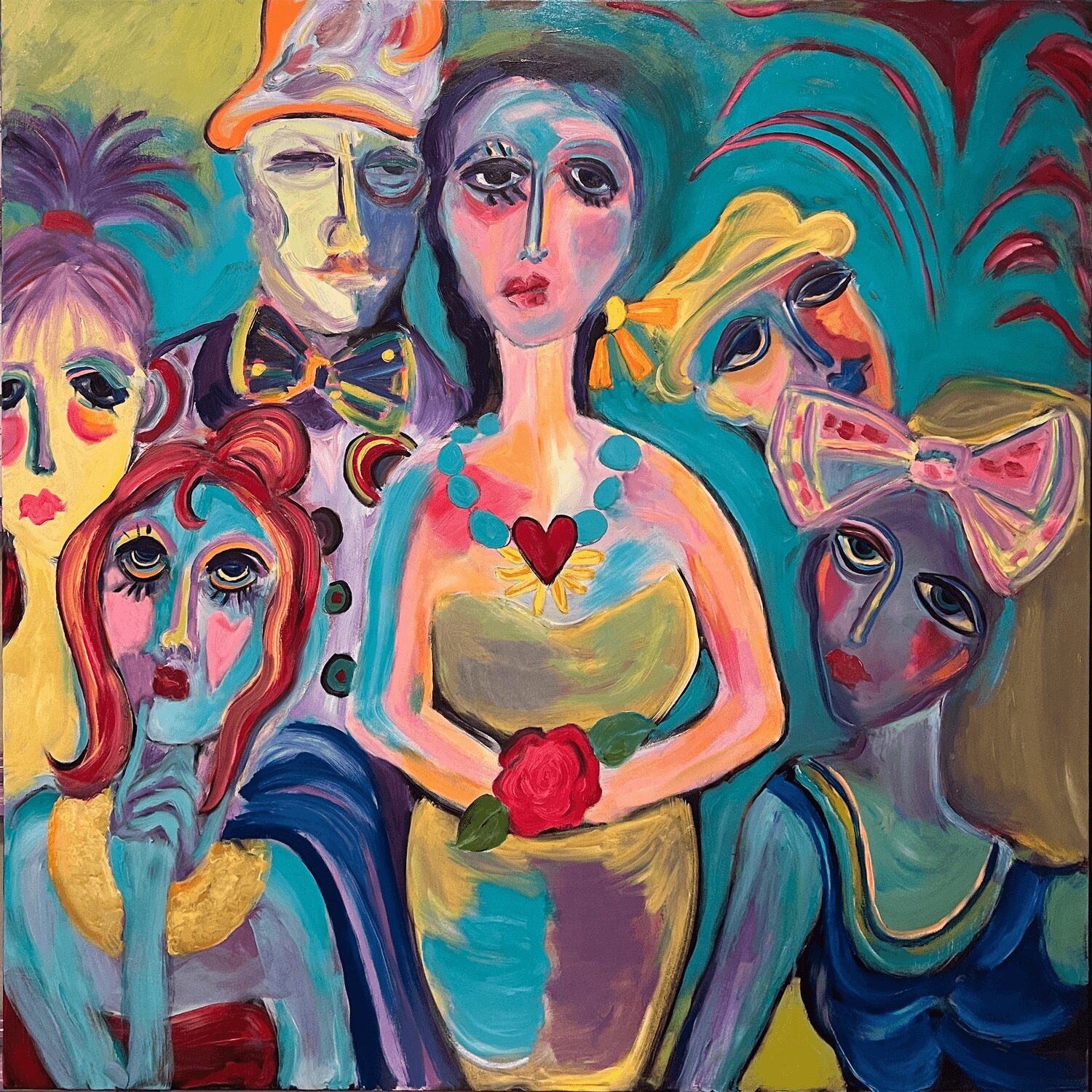 I often experience long periods of quiet reflection, where I’m not actively working on anything. Then, as if out of nowhere, ideas flood in all at once, like plucking them out of thin air. Everything starts to fall into place—the images, the context, the composition, and the color. I blend elements of relationships, both fun and serious, sometimes with a touch of kitsch. My goal is to create pieces that are thought-provoking and stimulating. The artwork starts to come alive, and eventually, I reach a point where I decide it’s time to move on to the next piece.
