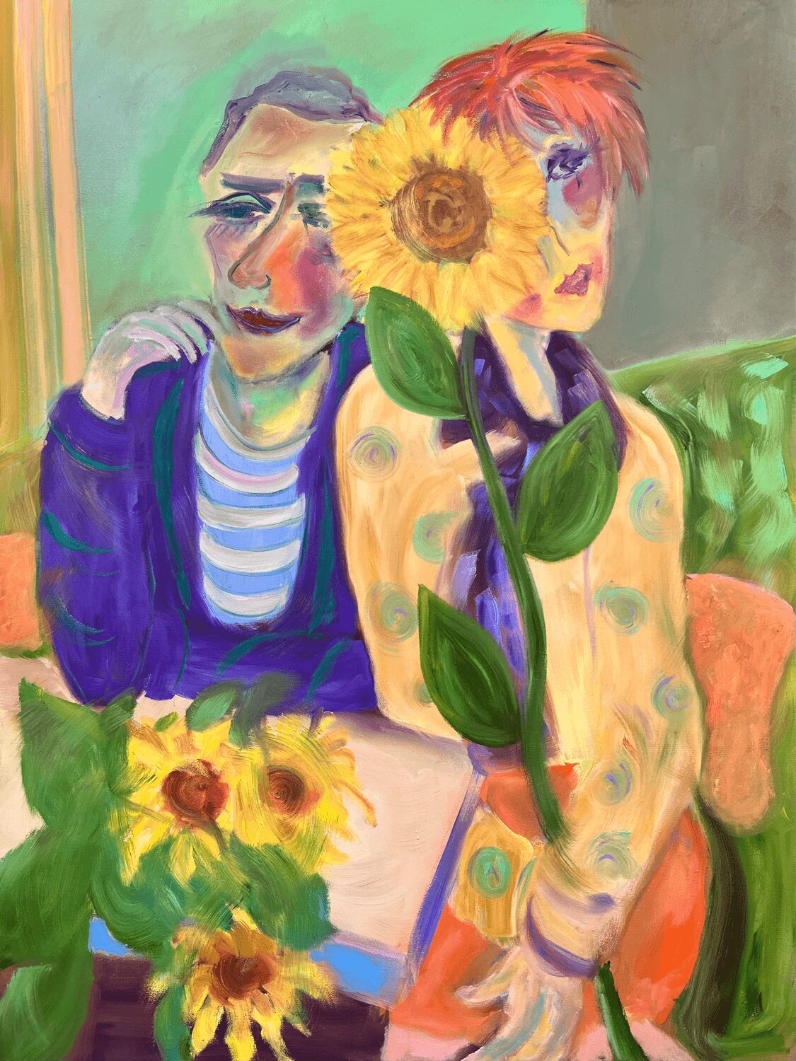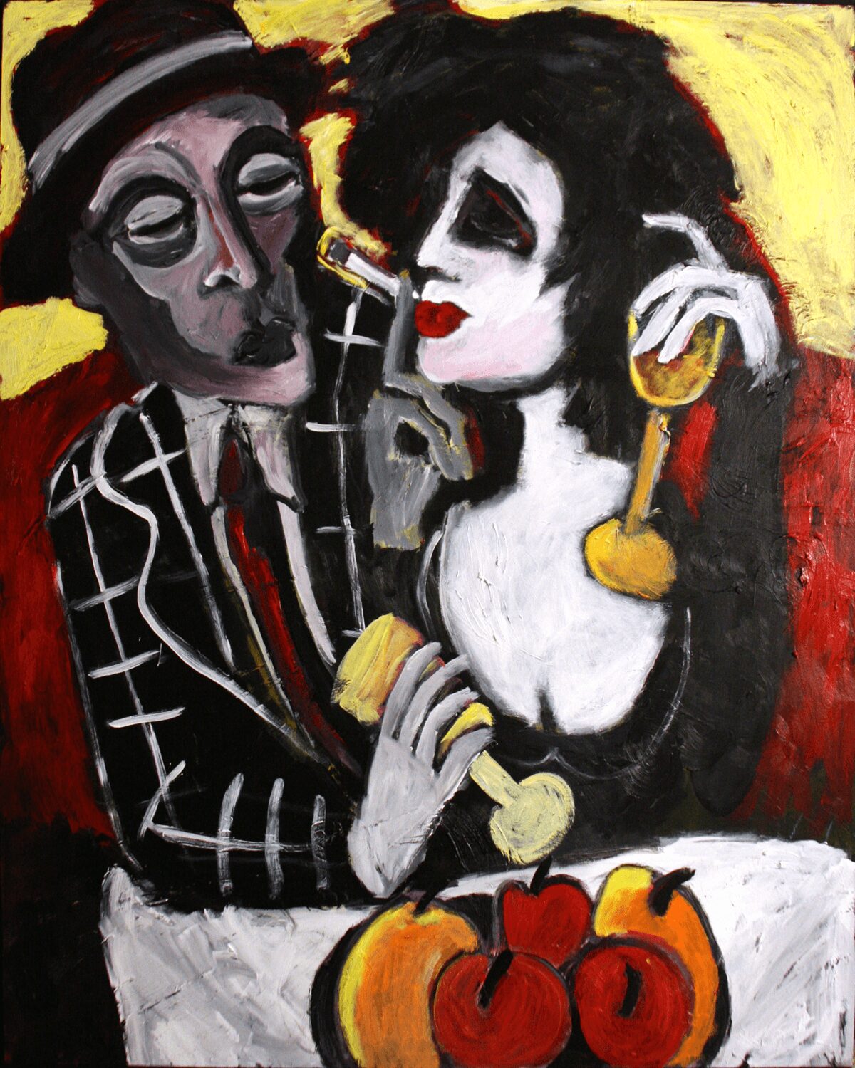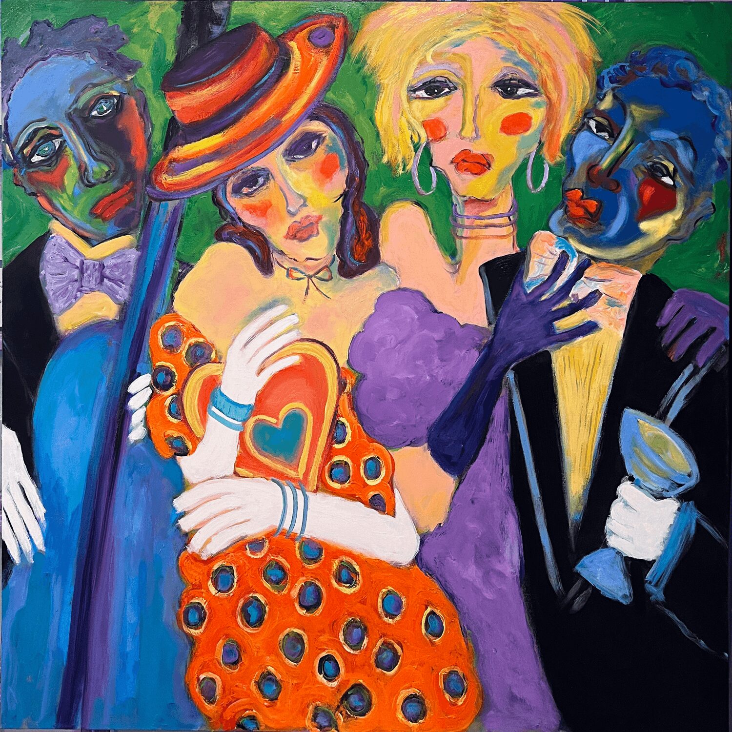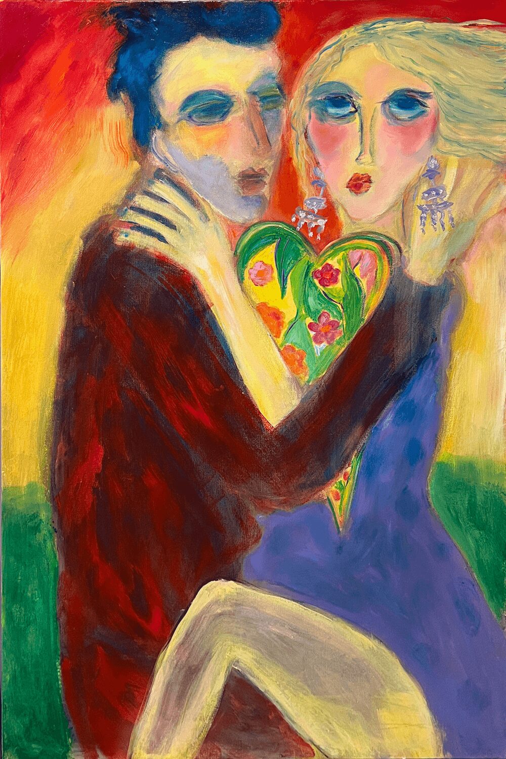 I often experience long periods of quiet reflection, where I’m not actively working on anything. Then, as if out of nowhere, ideas flood in all at once, like plucking them out of thin air. Everything starts to fall into place—the images, the context, the composition, and the color. I blend elements of relationships, both fun and serious, sometimes with a touch of kitsch. My goal is to create pieces that are thought-provoking and stimulating. The artwork starts to come alive, and eventually, I reach a point where I decide it’s time to move on to the next piece.