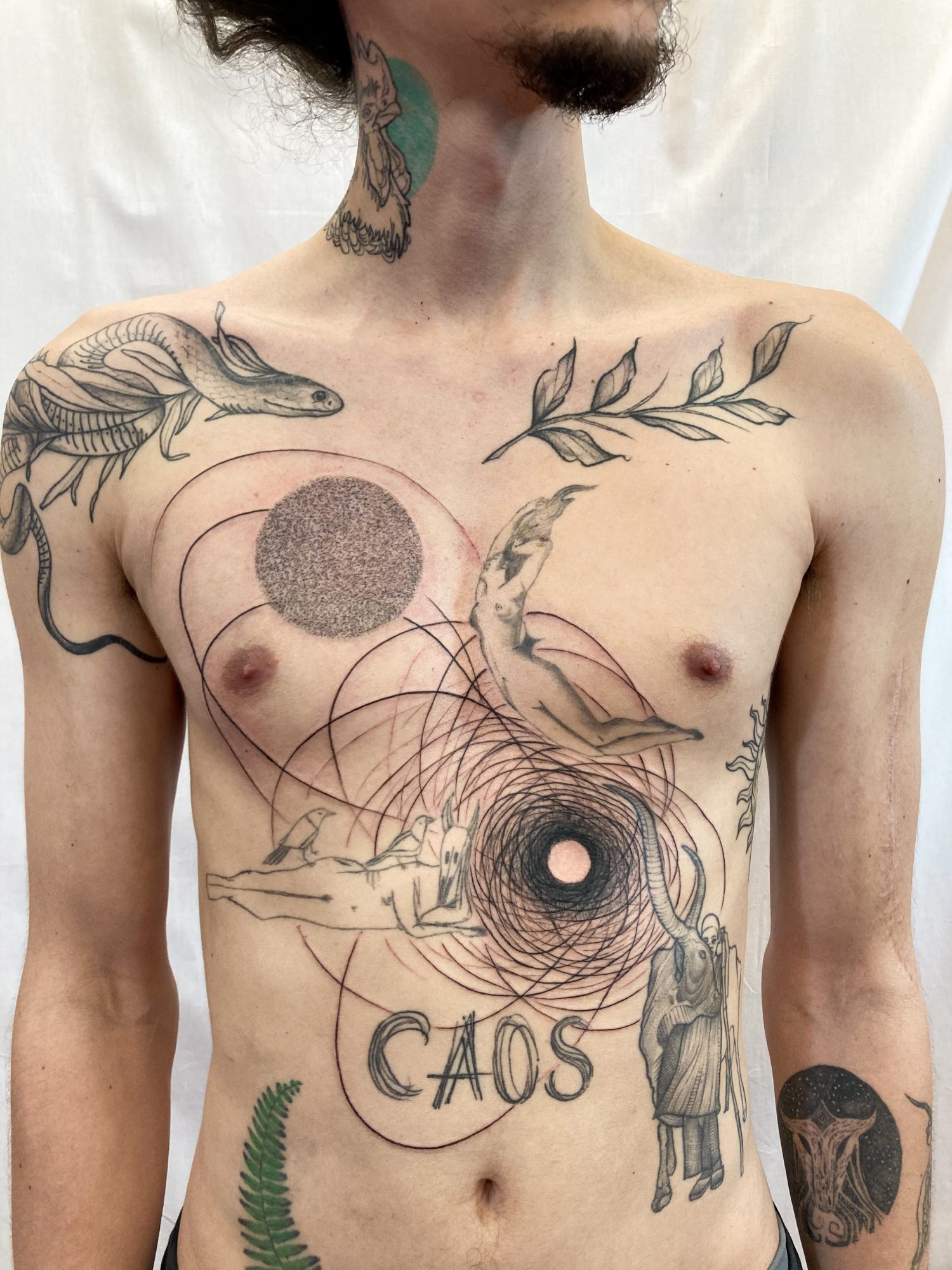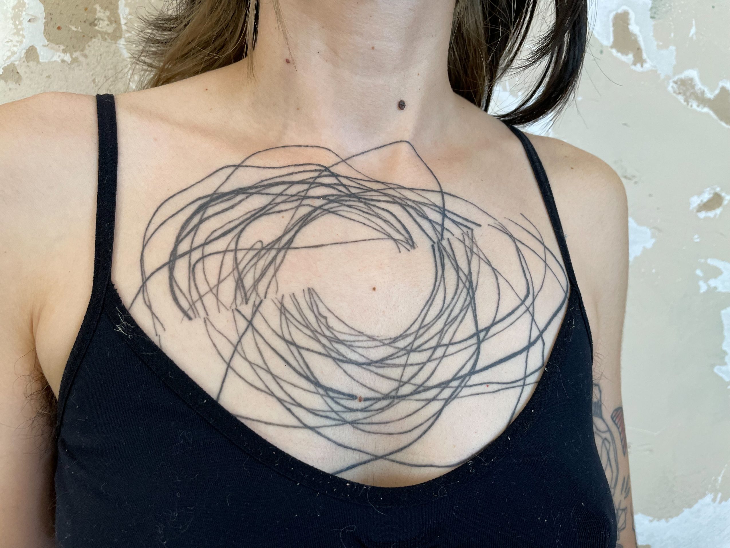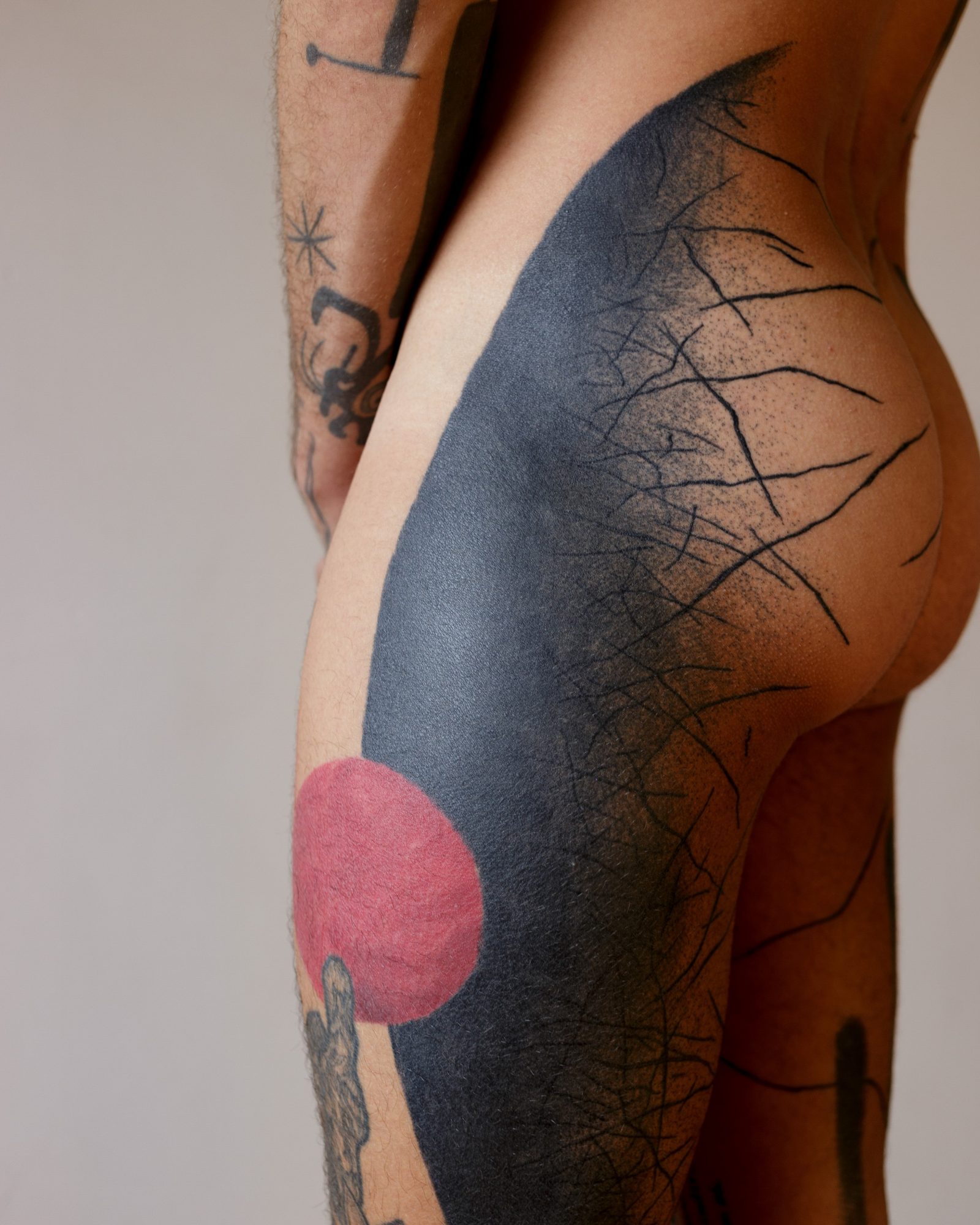 My work is dedicated to contemporary tattooing/art, exploring drawing in an intimate and existential way, and how it connects and expands when in contact with other human beings. I like to think for and compose with the body, considered not as a “canva to support my art” but as a person it is, and how they can wear design for life. I’m very involved in researching large abstract pieces, trying to balance solid and simple shapes with chaotic gestural lines and textures. I’m also developing a series called ‘visagens’ with smaller sketch drawings, which started five years ago like a classic “flash tattoo sheet” and had mutated into some kind of experimental graphic novel, but still all “tattooable”, or at least as an inspiration to get some.