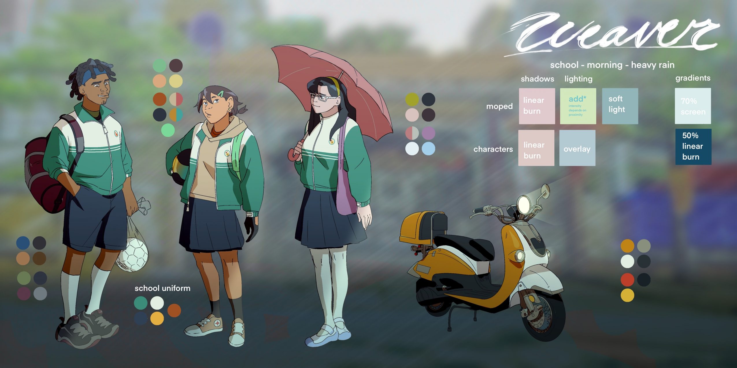 I am a color designer and character designer through and through! I enjoy the process of creating special lighting conditions for assets in each scene of animation in ways that can adhere to or subvert expectations whenever necessary. With character design, I adore researching for inspiration, analyzing what possibilities work for a character, and taking all of what I’ve done to create an appealing character for the screen. The process of trial and error is so fulfilling. In fact, if you see any of my work, I don’t have a single style I strictly adhere to. I like trying new things every time since it really frees me to make mistakes and use what I’ve learned to perfect my abilities. Plus, it keeps drawing fresh and interesting.